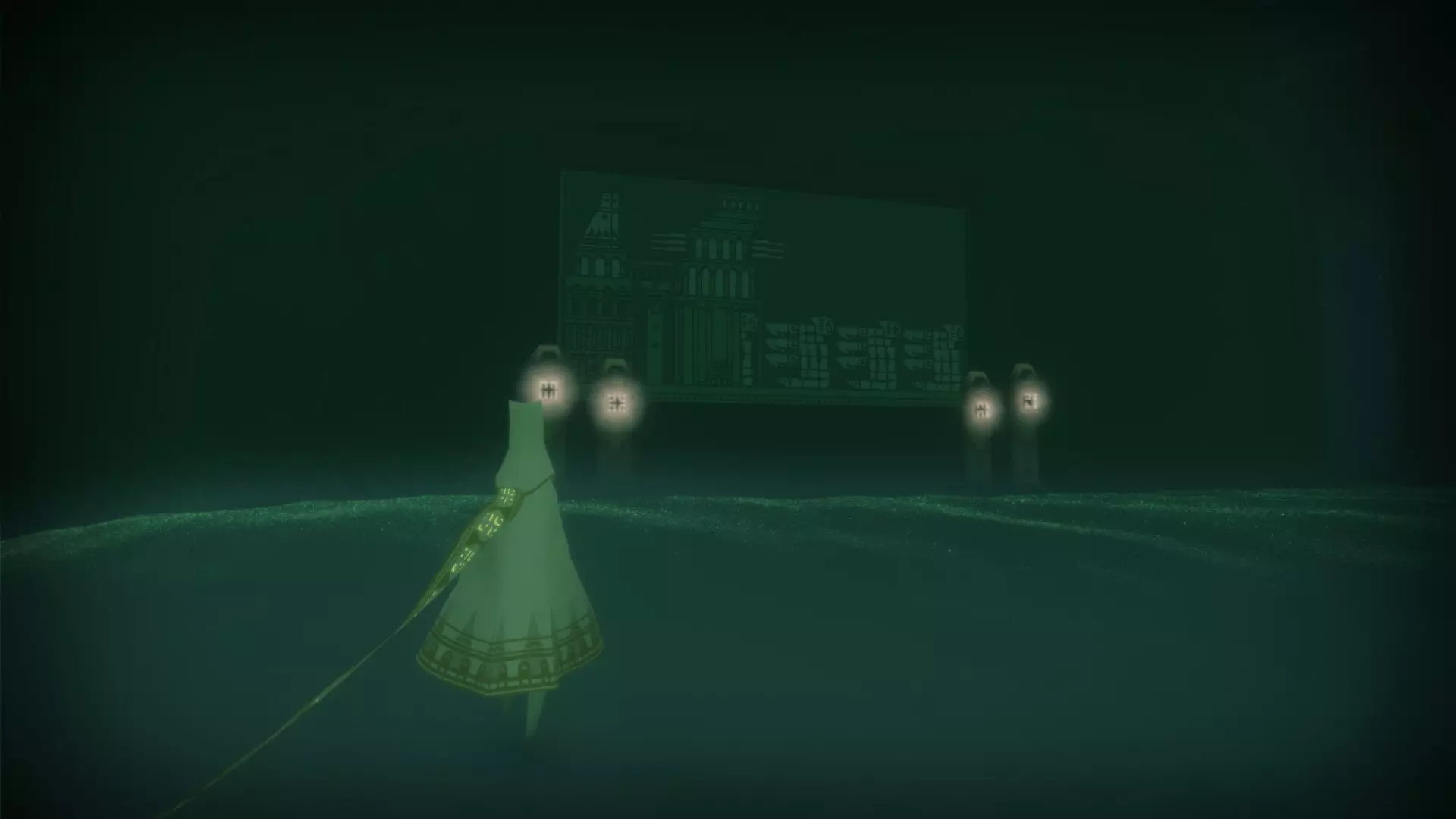 第二个符号(Glifo)位于沉没之城的尽头。在跪在祭坛前,向左看,就能找到隐藏在阴影中的壁画。