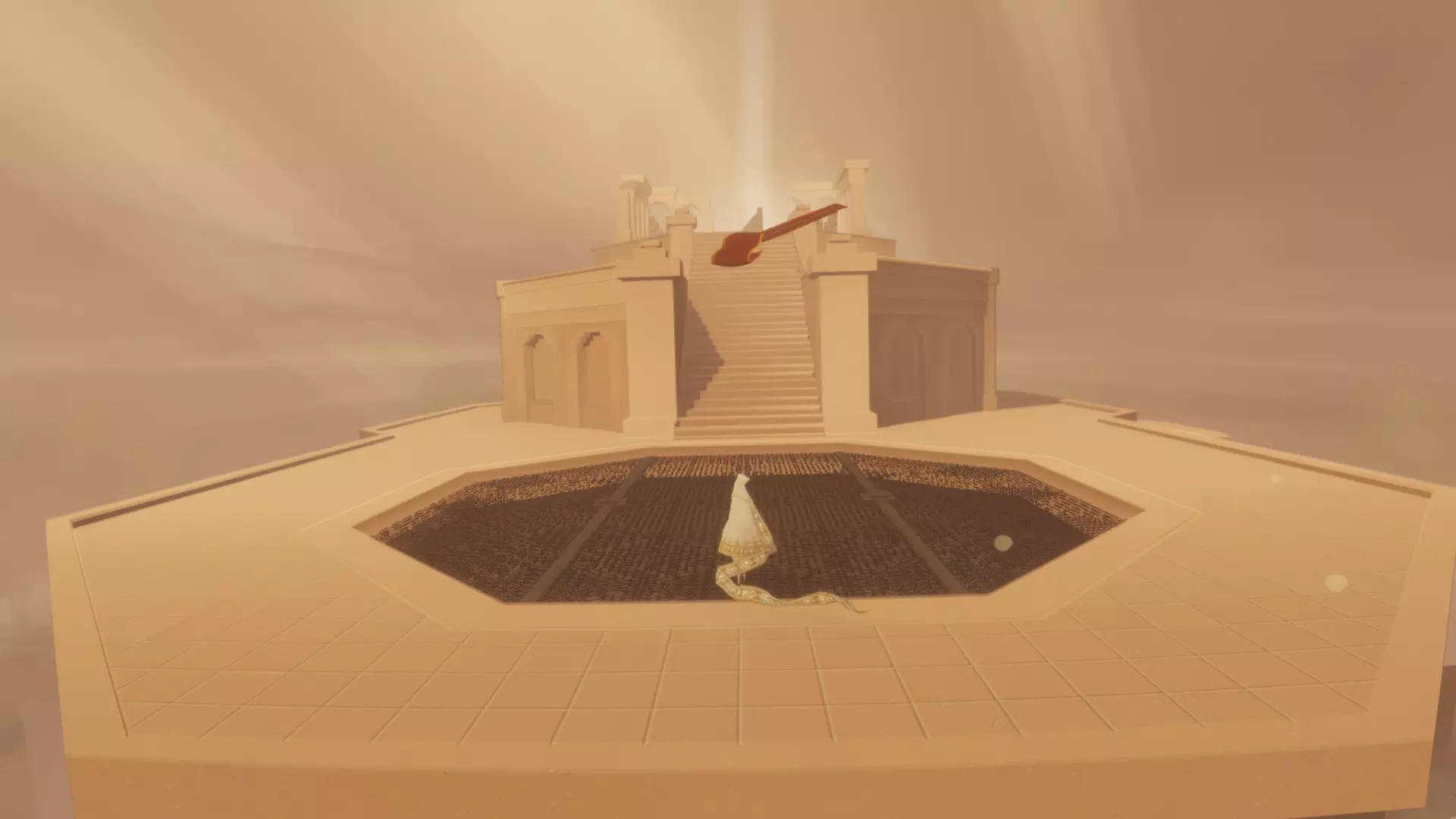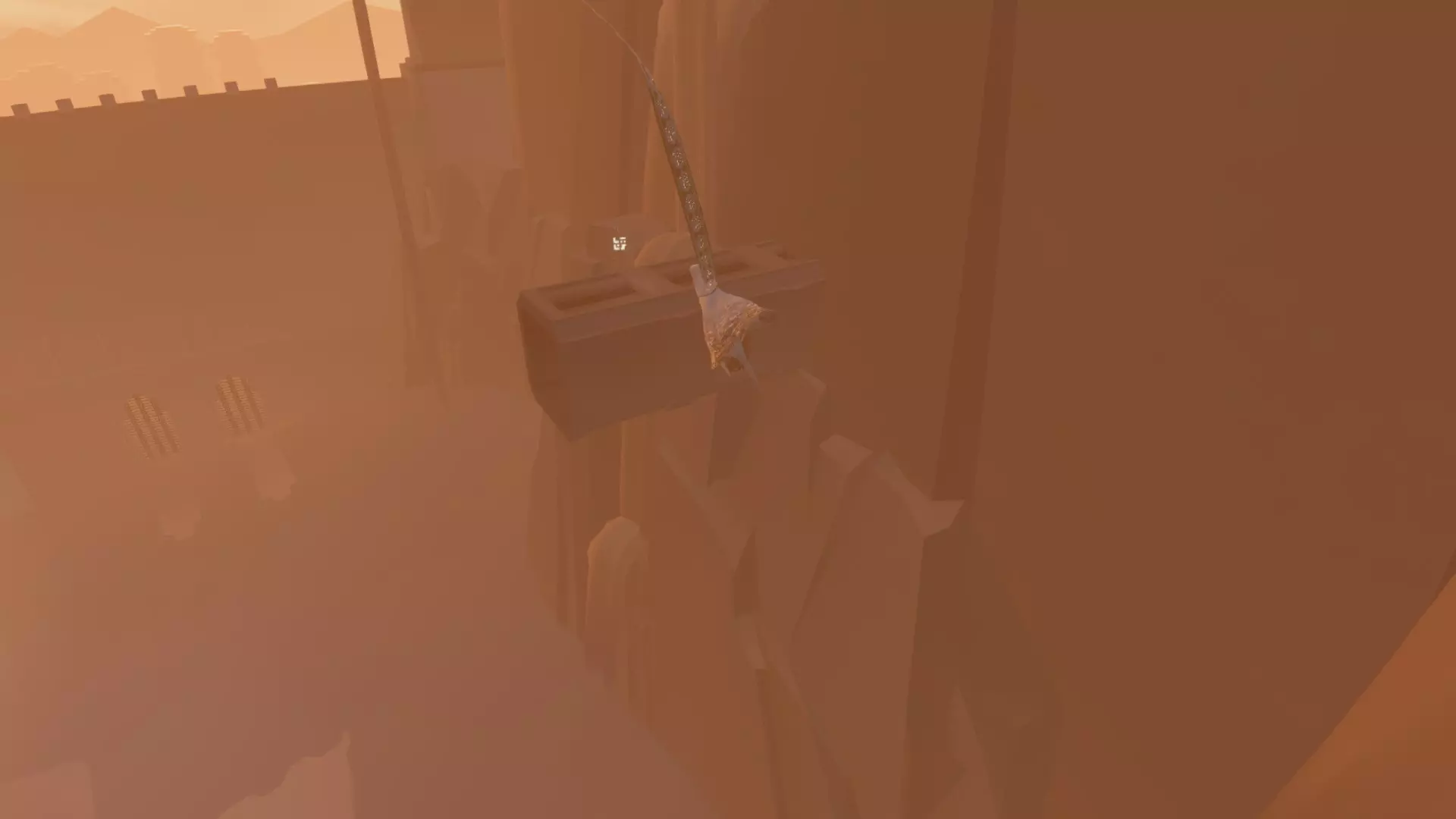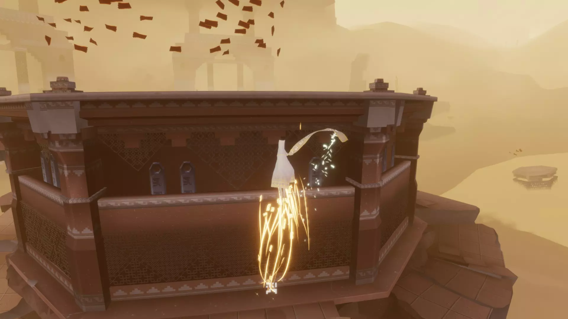 穿过沙瀑布后,你会坠入一个巨大的深渊。向右转,漂浮到小平台上的发光符号处。