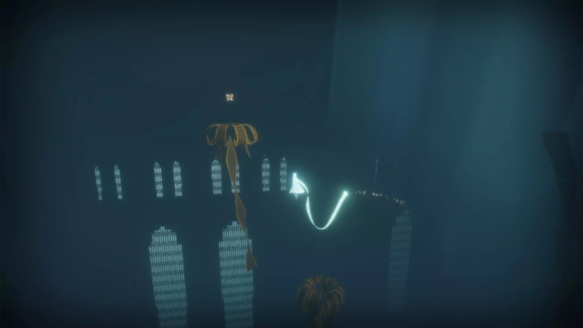 在下一个区域,你需要使用布条进行漂浮。接近终点处有一些类似水母的生物。符号位于最靠近顶部的那个生物身上。