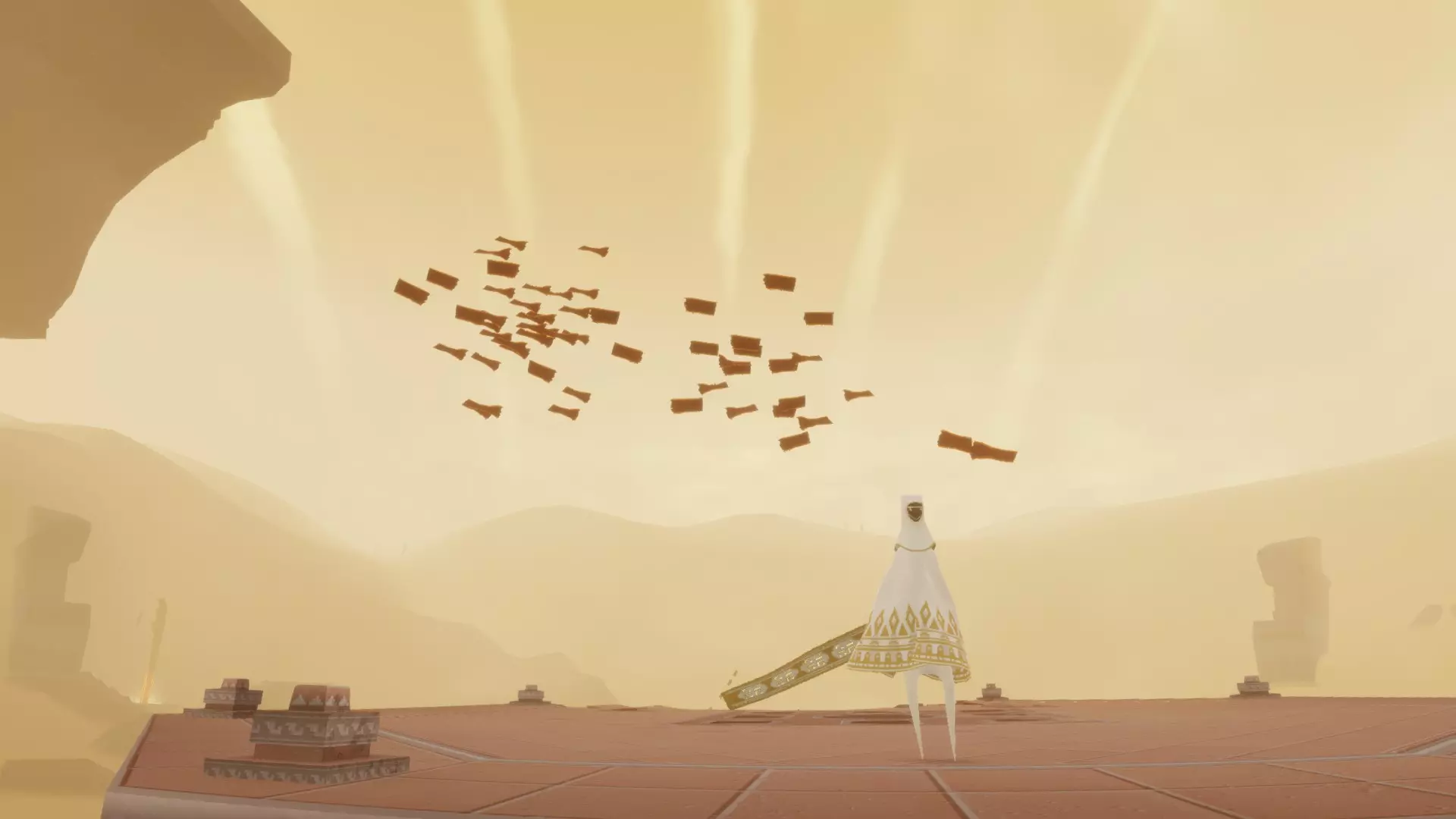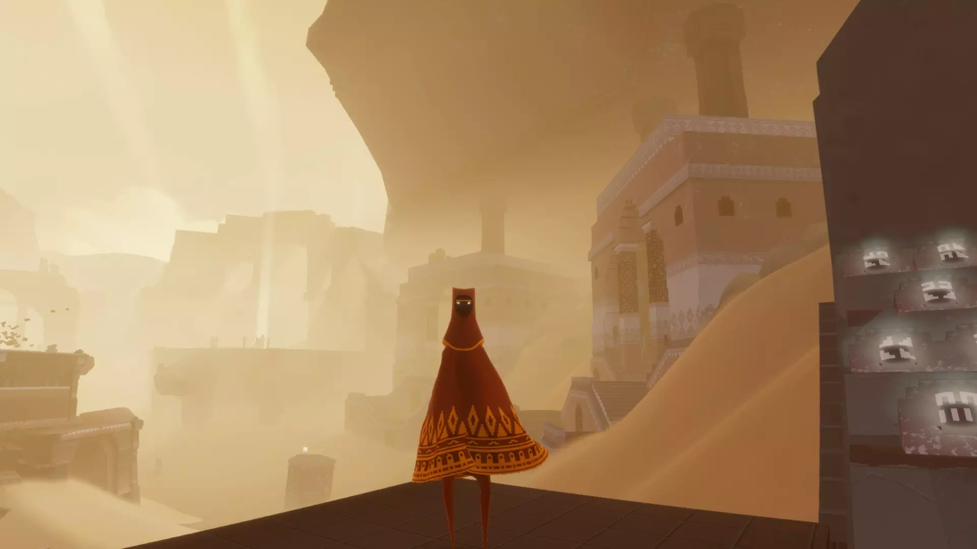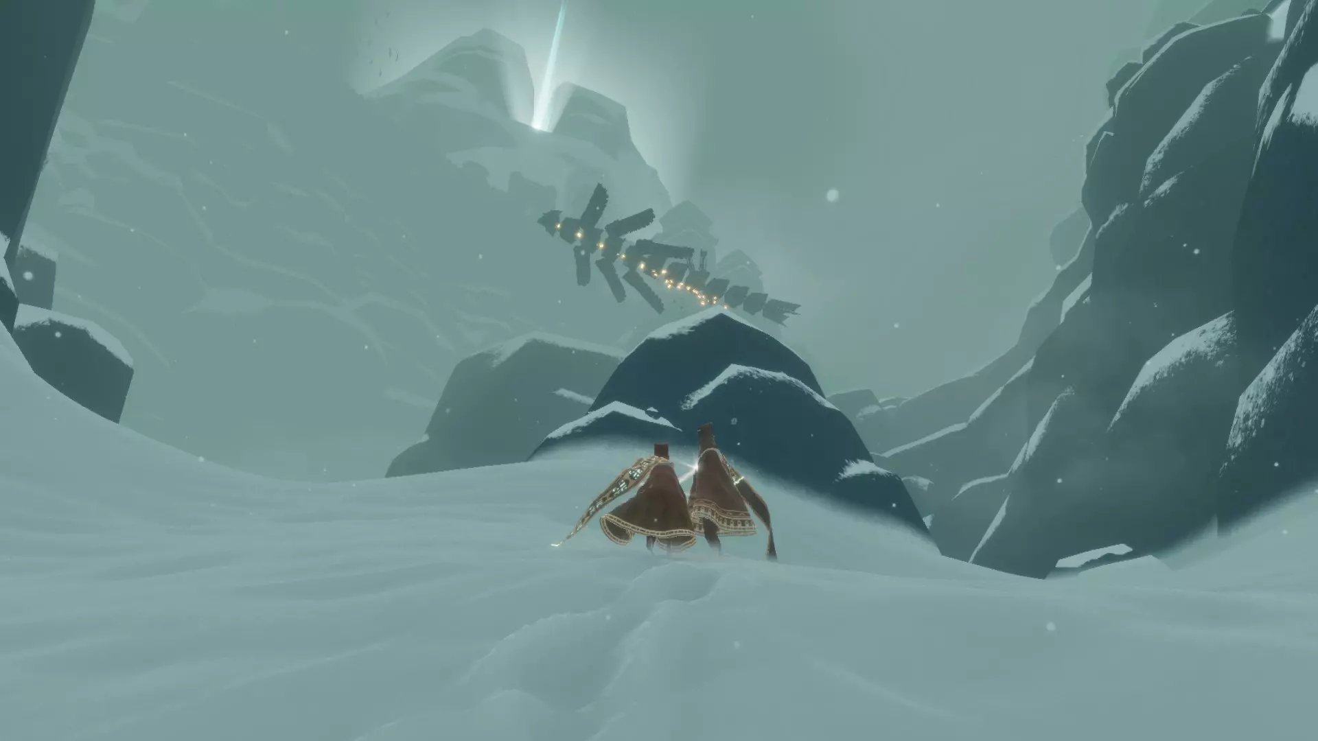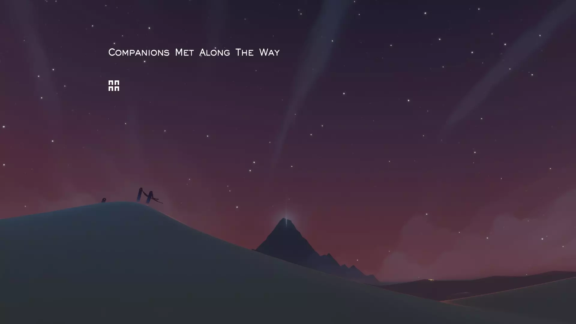 这款游戏没有直接与其他旅人交流的方式,唯一的交流途径是通过声音和符号。同样,当你完成游戏并回到起点时,会出现制作人员名单,其中会显示你遇到过的旅人。据我所知,在主机版的制作人员名单中会显示旅人的名字,而在PC版中则只会显示一个符号。