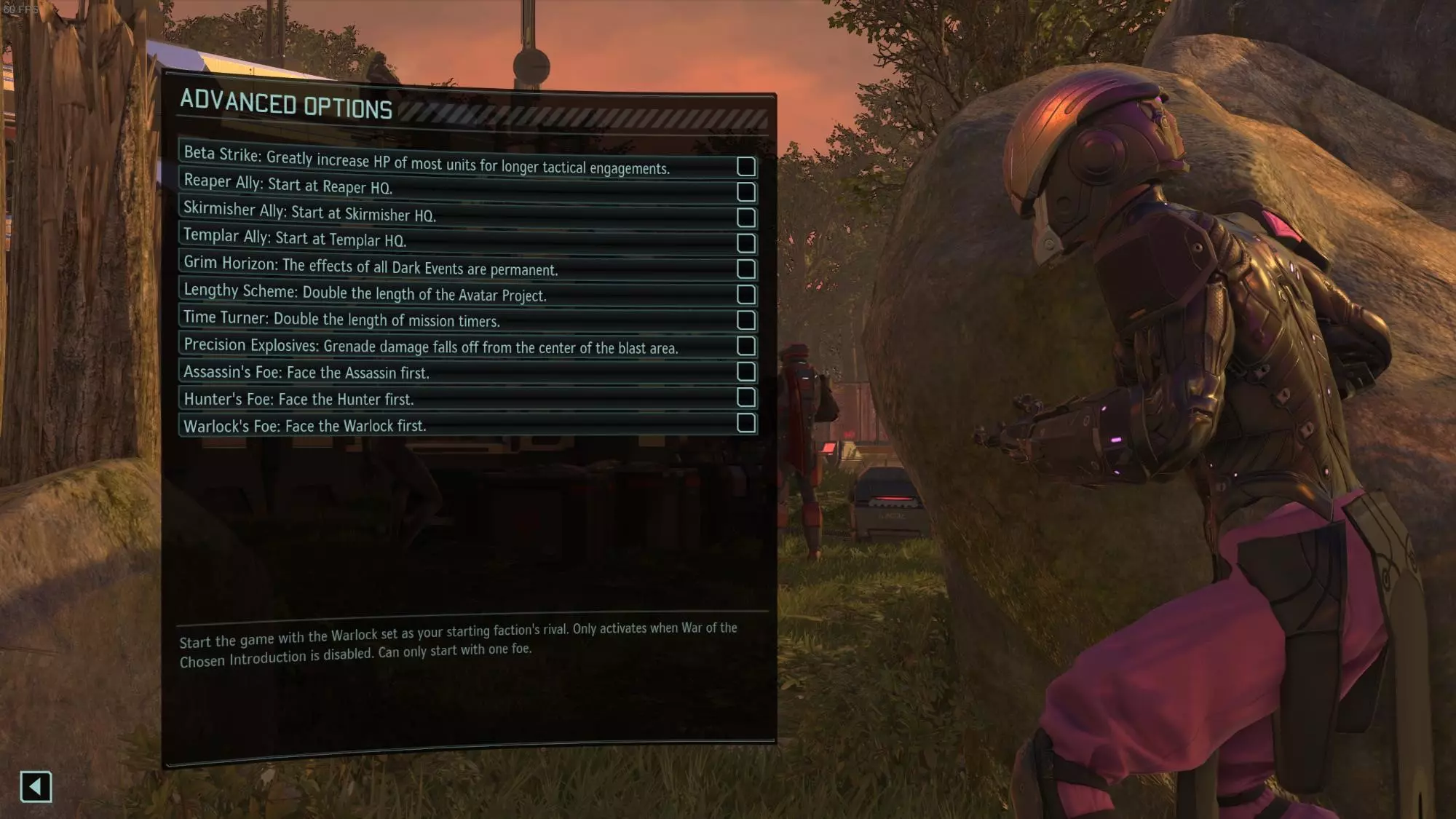 “Beta strike”通常是一个不太受欢迎的选项,不过也有一些人喜欢。我尝试过一次。想知道它是什么感觉的话,可以想象一下,在任务2中,几个拥有20点生命值的“ Sectoid( Sectoid)”控制了你的新兵。这是一种截然不同的游戏体验,我不推荐新手尝试。 收割者/游骑兵/圣殿骑士盟友: 如果你在新游戏设置的后期选择了“失落与遗弃”(请参阅本指南的“可选叙事内容和集成DLC”部分),那么你在此屏幕上选择的盟友将被忽略,并且在“Gatecrasher”任务中不会以派系盟友的身份开始。 如果你未激活“失落与遗弃”,且在高级选项中未选择派系盟友,那么在“Gatecrasher”任务中,你的队伍将随机获得一名派系盟友。选择“收割者”作为盟友通常是最容易的开局方式。移动选择对战术成功影响最大,而收割者的隐蔽侦察能力能显著帮助你做出更好的移动决策。不过,所有派系英雄开局都各有优势,因此建议尝试不同派系英雄作为初始盟友。“冷酷地平线”正如其名,永久黑暗事件会使游戏难度大幅提升。 “漫长阴谋”会让外星人完成“化身计划”并触发游戏结束倒计时所需的进度增加一倍。如果你觉得化身计划难以控制,可以选择此选项。 “时间转换器”会使限时任务的回合数增加一倍。部分任务的倒计时非常紧张,这极大地增加了任务失败的风险,或者为了及时完成任务而造成惨重伤亡。许多社区成员认为保持较短的回合倒计时是合理的,当你熟悉游戏后确实如此。若将倒计时延长一倍,你会几乎感受不到时间压力。一个折中的方法是使用《幽浮:未知敌人》的“Timer Tweaks”之类的模组。你可以尝试找到最适合自己的设置。 精准爆炸物:会消除对爆炸边缘单位造成最大伤害的可能性。这对爆炸物来说是一个显著的削弱,不推荐使用。 一些模组会在“高级选项”中添加游戏玩法选项。以下是一些示例: “第二波:选择天选者”模组允许你选择首先面对的天选者。猎人可能是最简单的,刺客则是最难的。 有许多优秀的模组可以随机化初始新兵的属性,并在高级选项中添加相关设置。我个人更喜欢“点数制:天赋各异”。 教程 通常情况下,传奇难度无法游玩教程。我建议只在进行你的第一个战役时才游玩教程。 请注意,教程中的第一个任务完全是脚本化的,你只需按照指示点击即可。 如果你想在传奇难度下使用教程,有一个模组可以实现这一点。我不推荐它,因为与正常开局不同,你的“复仇者号”不会有一个预先挖掘好的免费房间:传奇教程启用器。 点击“下一步”后:选择铁人模式或非铁人模式