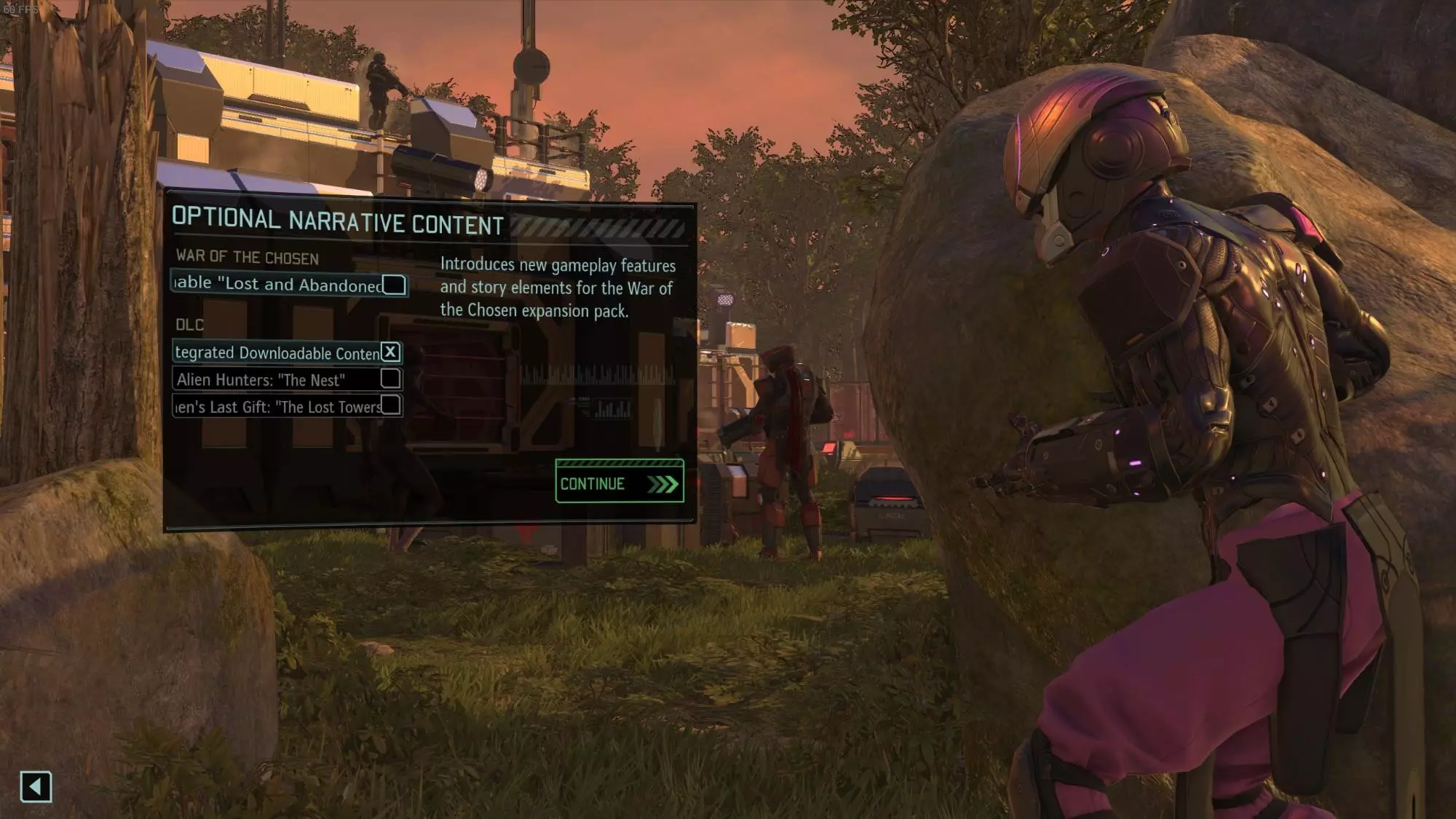 There are some spoilers in this section. Much of this information is contained in a table I uploaded to Google Drive: Optional Narrative Content and Integrated DLC Table[docs.google.com] Lost and Abandoned Enable this series of missions at least once to play the content. It is a scripted series of missions that you won't otherwise experience. I suggest disabling Lost and Abandoned for most playthroughs because when you play through “Lost and Abandoned” your first faction soldier will always be a reaper and your first chosen will always be the Assassin. You won't have a faction soldier on the Gatecrasher mission and the flow of the early campaign missions will be different.If you enable "Lost and Abandoned," you will not have a faction ally on the Gatecrasher mission, even if you chose a faction ally earlier in the Advanced Options.Integrated Downloadable Content If Integrated Downloadable Content is kept checked: To get the Alien Hunters weapons you will need to research Experimental Weapons with Tygan, build the Proving Grounds, and then individually manufacture each of the Alien Hunters weapons in the Proving Ground. This the slowest and most expensive way to get these weapons. The weapons are very powerful, so some may consider this a more fair way to get the weapons. The Alien Rulers will be assigned to guard Avatar facilities as they are constructed. Each facility guarded by an Alien Ruler will be marked with yellow warning text about a powerful enemy being at the facility. The first new facility will have the Viper King, the next the Berserker Queen, and the third the Archon King. If you make a note of each facility as it is built, you will know exactly where each Ruler is located. If you do not kill the Ruler when you assault the facility they spawn at, that Ruler will then start to show up randomly on missions. This makes assaulting the earliest Avatar facilities much more dangerous and meaningful at early levels and so can make controlling Avatar project progress more challenging. SPARKs can be built in the Proving Grounds by choosing the "SPARK" project. If you uncheck Integrated Downloadable Content: I recommend enabling "Alien Hunters: The Nest" and "Shen's Last Gift: The Lost Towers" each at least once to experience the content. You will be taken through a couple missions you would not otherwise experience. The "Alien Hunters" and "Shen's Last Gift" missions are not directly integrated, so you can enable one while not enabling the other. You can try both missions in the same campaign or try them separately in different campaigns. If you do not enable Alien Hunters, then:The Alien Rulers will eventually show up randomly on missions You can individually build each of the Alien Hunters weapons at any time simply by choosing "Build Items" under the Engineering tab and paying the required amount of supplies. You will be able use supplies to upgrade the weapons as you tech up.If you enable the "Alien Hunters": (spoilers follow) You will get an early scan (“Location Beacon”) to pick up the frost bomb, bolt caster, shadowkeeper, and hunter's axe immediately, no proving grounds required, no construction time or cost. These weapons are extremely helpful early on. However, upgrading the weapons to higher tech tiers will be gated behind a later "Alien Nest" mission. The Alien Rulers are gated behind a later "Alien Nest" mission which is unlocked after you scan the "Triangulate Position" site on the world map (it will eventually show up marked with 3 skulls on the world map). If you don’t complete the "Alien Nest" mission, the Rulers will not spawn. You will be free to conduct any mission and attack any convenient avatar facility without worrying about Rulers. You can wait and do the Alien Nest mission after all 3 chosen are killed or whenever you prefer. Note that you can't upgrade the bolt caster, shadowkeeper or axe until after you complete the Alien Nest mission. That has no effect on the frost bomb which is extremely useful from the start, and the other weapons still feel useful due to their increased aim even when you have magnetic weapon options. The unupgraded axe does as much damage as a tech tier 2 sword and gives one free action attack, so you will probably want to use it at least through tech tier 2. The Alien Nest mission features the Viper King and a couple dozen junior vipers that Central can melee to death using his reaper skill. If you bring strong enough soldiers (e.g. a reaper with expanded magazine, repeater and the banish skill), you can kill the Viper King on its first appearance. After the Alien Nest mission, the Alien Rulers will show up at random* on future missions. If you have the Shadow Chamber up and running, you can tell that an Alien Ruler is on the mission if it has an unusually low amount of enemies. If you wait until very late in the campaign to do the Alien Nest mission, the Alien Rulers will show up on your very next missions. If you didn't kill him at the Nest, the Viper King may be on cooldown, but the Berzerker Queen and Archon King can show up on consecutive missions. If you don't want to play with the Alien Hunters weapons or Alien Rulers, the only way you can do that is by enabling the Alien Hunters and then never scanning the Location Beacon.If you enable Shen's Last Gift you will get a mission scan to investigate the "Lost Towers". At the end of the mission you will get a free SPARK and you can build additional SPARKs in the Proving Grounds. If you do not enable Shen's Last Gift, SPARKs can be built in the Proving Grounds by choosing the "Mechanized Warfare" project.