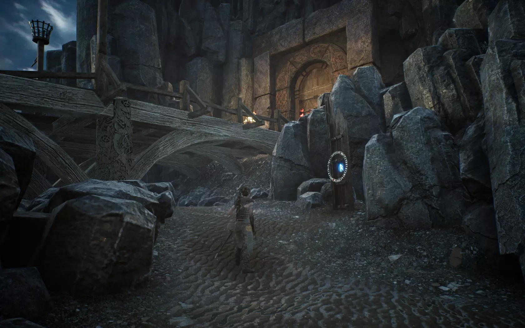 从第一块符文石向右走,前往断桥和门所在的位置 20)沿着唯一的路径继续前进,你会到达这里: