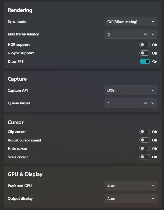 根据你的显示器设置,将目标帧率设为最大刷新率(每个人的设置可能不同)。我的显示器是144Hz,所以目标帧率必须设为144fps。 在此处添加缩放功能,可使小窗口显示为全屏效果(不会影响性能)。 最后,我在Windows 11系统中使用DXGI,这对我来说似乎能带来更好的性能。你也可以根据需要进行更改。