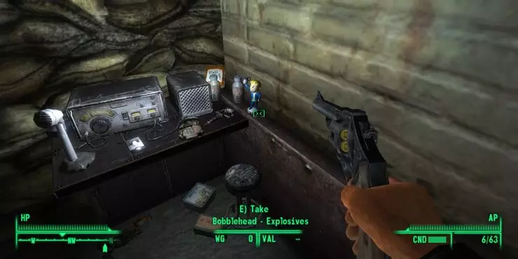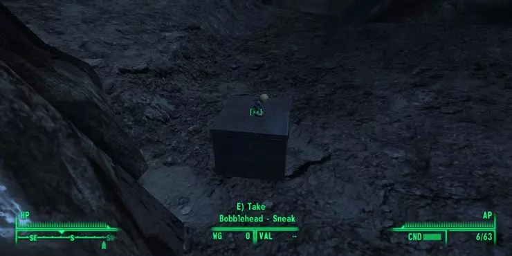 进入洞穴后,从入口向南走。摇头娃娃位于第一个大洞穴中,在入口斜坡的左侧。你会在一具腐烂的婆罗门尸体旁找到它,旁边还有一枚小型核弹和一本技能杂志。 位置:死亡爪避难所 效果:耐力+1 控制台代码:player.placeatme 00038834