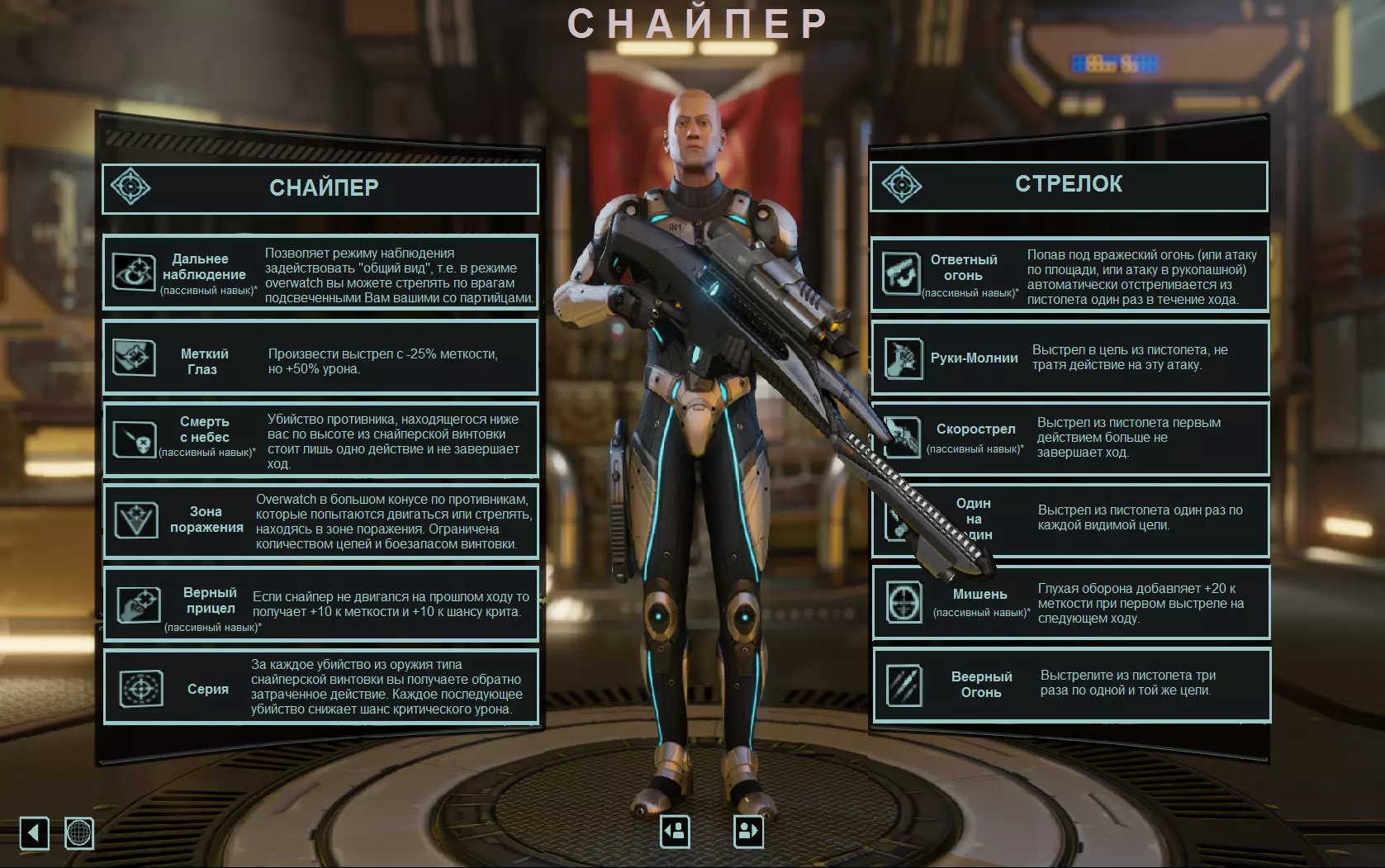 需要明确的是,“Рейнджер”是一名近战突击手,他始终身处前线,必须率先进行侦查并在战场上快速移动,最后迂回到侧翼,消灭所有试图移动的目标并造成暴击伤害。 指挥官,为什么我们建议您使用近战武器(ПБМ)和闪避型护甲,而非生命值(ОЗ)和普通护甲呢? 这里为那些明天要在物理课后参加数学考试的人准备了一些数学分析。假设我们有一个处于理想条件下的真空骑士(2级游侠)。 1)PBM(精准瞄准模块)+27闪避,“幽灵”套装+25闪避。总计52闪避,16生命值 2)PBM(精准瞄准模块)+4生命值,战斗套装+2护甲。总计2护甲,20生命值。 在理想条件下可进行3次10点伤害的射击。 1)3次划伤 = 10/2*3 = 5*3 = -15生命值,剩余1生命值,未计算未命中情况。 2)2点护甲 = (10-2)*3 = -24生命值,我方特工壮烈牺牲,但带有护甲。“幽灵”服装在游戏后期还会额外提供+2移动力(奔跑格数)、穿透障碍物的能力以及用于更灵活机动的猫咪。 武器上始终镶嵌“距离目标越近,暴击率越高”的增益。游侠几乎总是处于近距离作战状态,因此借助你的强化,暴击率将达到35%以上(最高可达100%)。作为第二项改进,建议加入自由行动的概率,这能让你对sectopod( Sectopod)的眼睛造成多次暴击。或者,你也可以尝试快速换弹或扩展商店。在游戏初期阶段,最好为武器配备“利爪”弹药,以提高游侠的暴击几率;而在后期副本中,当“ Advent”单位的总护甲值提升时,再将其更换为穿甲“AP弹药”。在你获得“幽灵”装甲之前,第二个槽位可以装备普通、等离子或酸性手榴弹,或者选择“地狱花纹”装甲,该装甲能增加近战伤害(与“碎肉机”配合使用时对异虫幼虫效果显著)。 狙击手: 远程战斗专家。配备“准德拉贡诺夫系统,若非卡壳版”狙击步枪和无需每次射击后重新装填的手枪。与《幽浮:未知敌人》不同,狙击手一开始就拥有“全局视野”,即如果我方任何一名士兵能看到敌人,狙击手就可以射击半个地图外的敌人。从游戏一开始,凭借初始阶段的精准度以及在不暴露自身的情况下消灭敌人的能力,狙击手就是我们的主要杀伤武器之一。 技能