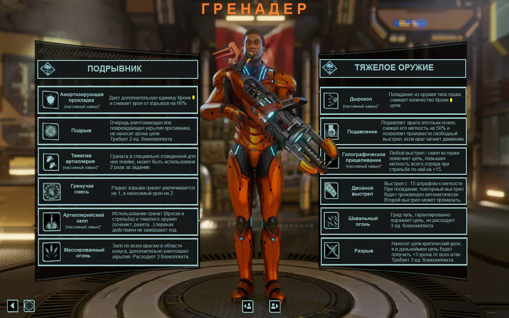 小贴士与技巧 grenadier( grenadier)是我们的 AoE(Area Of Effect - 范围效果)担当。 grenadier的主要任务是,在敌人尚未散开时,在由游侠或我们的探测器标记出的区域,引爆尽可能多的敌人集群,以此开启战斗。 初始等级的核心规则遵循一个非常简单的原则:“**手榴弹不要省!** ”另一方面,必须足够小心,以免丢失珍贵的战利品,这些战利品会随着我们来自“Адвента”的好朋友爆炸而掉落。 “破甲”效果会根据你武器的威力来减少护甲值。如果你使用标准步枪,每次命中会减少敌人1点护甲,但突击步枪(等离子武器)每次可以直接移除所有3个黄色菱形护甲。任何火炮的攻击技能都会自动激活“破甲弹(Дырокол)”。 火炮的单体攻击技能(“压制”消耗2点弹药,“双重射击”消耗2点弹药,“爆破”消耗3点弹药,“速射”消耗3点弹药)除“破甲弹”外,还会激活“全息瞄准”。 若两名火箭筒手对同一目标进行“压制”,其精准度惩罚将叠加。我们可以将掷弹兵划分为两个发展阶段: 在初始等级阶段,掷弹兵可以打造出拥有2-3级护甲的“钢铁侠”(1级护甲来自下士军衔+1级来自防弹背心+1级来自外骨骼)。再加上手榴弹相关的技能点,这样我们就得到了一个来自“突击队”的英雄——配备2-3枚手榴弹、1具火箭筒,拥有大量护甲和生命值,简直就是一个行走的“ Sectopod”(重型机动兵器)。在游戏后期,最好将我们的爆破手送去重新训练,转型为装备了电影《异形》中六管炮的攻击型“柯南-野蛮人”。选择“破甲弹”来击穿敌人的护甲,再搭配“全息标记”和“撕裂”技能。武器与装备(取决于你的发展路线) 爆破手 机枪手 PBM(便携式弹道导弹) 弹药 精准度 护甲 外骨骼 战斗服 武器 扩展商店 扩展商店 + 精准度 物品 酸液手榴弹、防弹背心和弹药 燃烧/毒手榴弹、蓝屏子弹