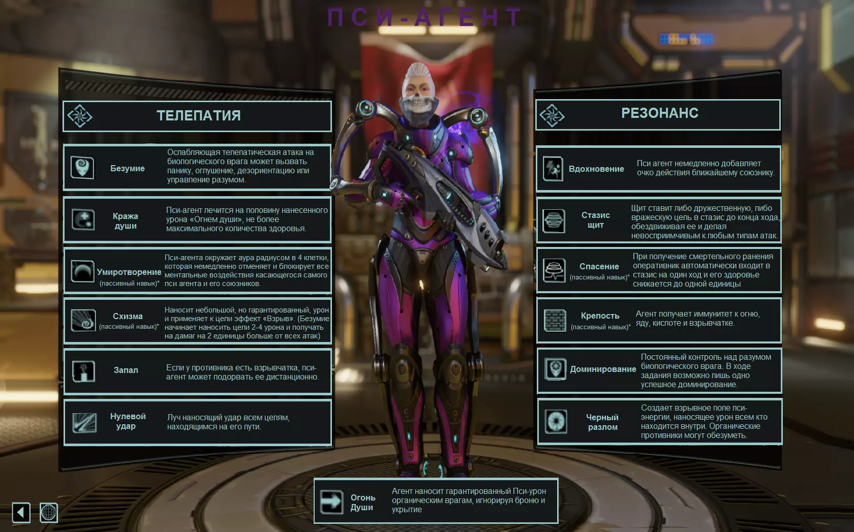 技巧与窍门:需要明白的是,灵能特工是一名全能士兵,虽然可以在战场上大显身手,但他最适合的定位是半辅助角色。没错,他确实有两个可以攻击“ Advent”友军的范围技能,但更好的做法是为狙击手增加一个行动机会,让其通过“连射”技能在重新装弹后消灭尽可能多的敌人,或者在其他队友解决掉其同伴时,将仙女座士兵置于“停滞”状态。与其他士兵不同,只要您有足够的时间和资源,就可以学习技能树中的所有技能。心灵能力并非按顺序解锁。您将从列表中随机获得三个选项,然后开始训练。如果您想派遣特工执行任务,可以中断训练。他们会在之后自动继续训练。 心灵特工不会因击杀“ Advent”友军而获得经验值和成长。无需追击他们。 若你的队友陷入恐慌或精神被控制,灵能者需靠近并进入其“安抚”光环范围,以消除负面效果。 可同时控制两名敌人,方法是对一名使用“支配”,对另一名使用“疯狂”。 “停滞”能使敌人眩晕一回合,并在此回合内免疫伤害。对 Sectopod( Sectopod)造成最大 DPS(每秒伤害=伤害×每秒)。在最后一步将其击晕,第二天再进行第二轮。 “灵魂之火”对有机敌人造成必定精神伤害,无视护甲和掩体。 “引爆”是《幽浮2》中最出色的技能之一,其有趣之处在于能引爆敌人身上的炸药——无论敌人是死是活。尤其是在之前通过“支配”技能将该敌人送回敌群的情况下。PBM的武器与装备:所有你认为必要的物品 - **护甲**:战斗服 - **武器**:连发枪(有几率触发秒杀) - **道具**:蓝屏子弹
