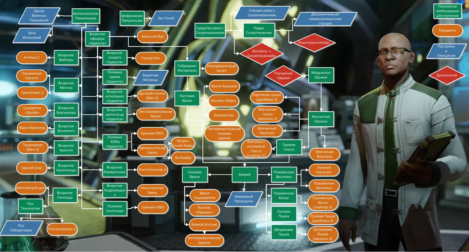 防御矩阵——在与不明飞行物(UFO)相关的特殊任务中提供额外防御武器,该任务即使没有此加成也能进行。 实验室——提升你的研究速度。+7%/+14%(升级后)的研究速度加成。与《幽浮:未知敌人》不同,这里的实验室只有一个。军事技术中心是非常重要的建筑,建议在游戏后期建造,除非你的特工在游戏过程中受伤较多。 该建筑能让士兵在升级时获得额外的技能。 **建议:建造时间越晚,少校升级时获得更高等级技能的几率就越大。**当士兵晋升为上校或将领阶级时,你的士兵将获得其他职业的上校专长。该专长允许重新训练士兵的技能分支。士兵需在医疗舱中休养10天,期间会重置所有已学习的技能。康复后,你可以重新分配其技能点。 此外,该专长还能加快伤兵的治疗速度。在传奇难度下,重伤会使干员( оперативников)在一个月内无法参与战斗。如果你的任务无法达到优秀或完美评价,或者你采用“终结者”式玩法,那么这栋建筑需要尽早建造。 暗影大厅(Зал теней)是推动剧情发展的必要建筑。建造时会暂停所有当前研究项目。如果不需要,可以将其推迟到所有研究完全完成后再进行,这样您就能体验到游戏的全部内容。 研究实验室。 关于如何混合C2H5与OH以及混合比例的一些说明(点击可查看完整尺寸)