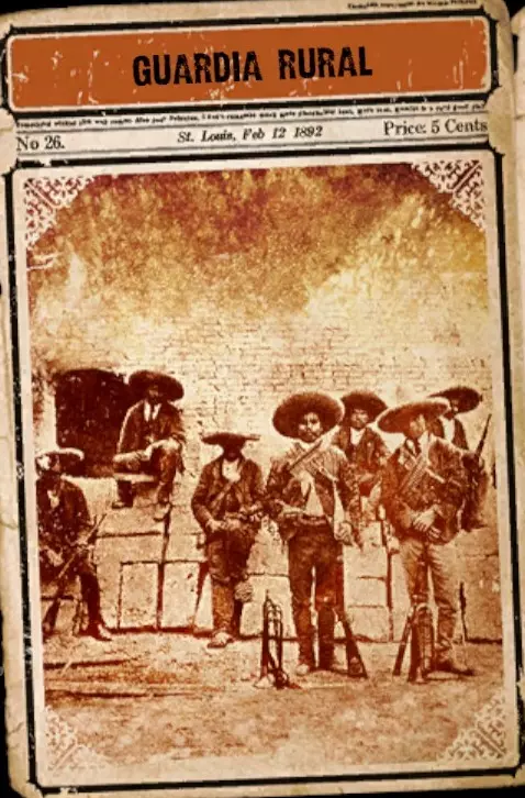 墨西哥乡村警卫队(Guardia Rural),通常被称为“乡村卫队”(Rurales),是一支墨西哥骑兵部队,负责在墨西哥境内打击土匪。该部队存在于1861年至1914年间,规模从最初的数百人逐渐发展到四千人。他们装备精良,配备马刀、步枪和手枪,身着特色鲜明的银边制服,头戴宽边帽,系着红领带或黑领带,堪称世界上最具特色的警察部队之一,仅次于梵蒂冈卫队。 1881年8月13日,在亚利桑那州与新墨西哥州边境的瓜达卢佩峡谷,一群心怀复仇的乡村卫队队员(可能由此前与土匪遭遇后侥幸生还的阿尔弗雷多·卡里略上尉指挥)突袭了“老男人”克兰顿及其“牛仔帮”的六名成员。两周前,克兰顿和“牛仔帮”屠杀了跨境运送白银的墨西哥走私者。而在那起事件的两年前,“牛仔帮”曾伏击并杀害了一队越境进入亚利桑那州的墨西哥 Rurales( Rurales 为墨西哥农村警察部队)。在瓜达卢佩峡谷,克兰顿的好运终于走到了尽头。包括“老头”克兰顿在内的五名“牛仔帮”成员在 Rurales 的伏击中丧生。 Rurales 在未经任何地方当局批准的情况下,于美国领土上采取了行动。因此,他们对克兰顿的复仇行为,与克兰顿两年前所犯下的罪行并无二致。 灰狼
