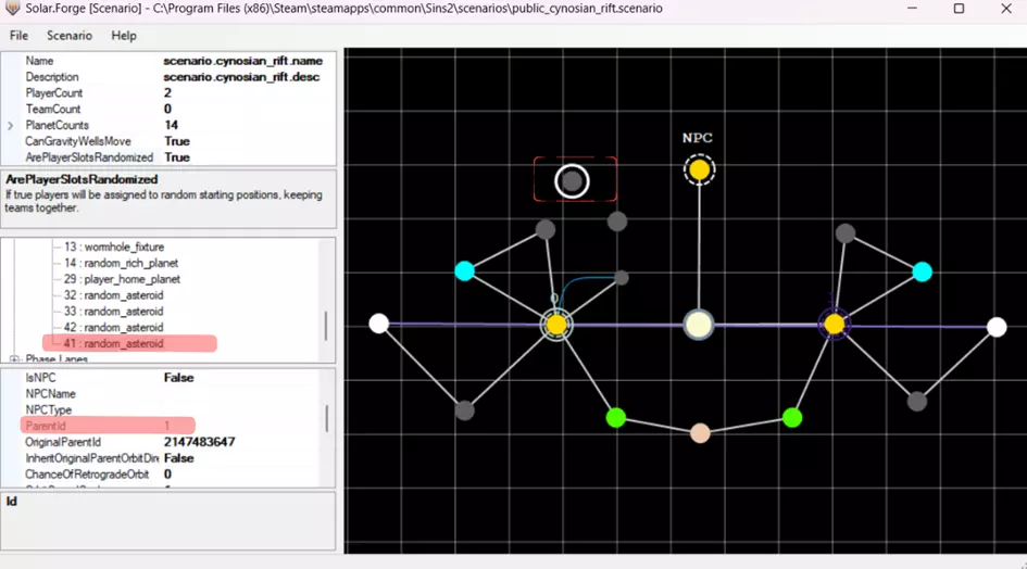 ID 描述 1 “非法”行星,无任何“父级”天体 2 以本地恒星为“父级”的行星 3 以另一颗行星为“父级”的行星 注意:太阳熔炉(Solar Forge)为你提供了创建地图时的更多灵活性,但此灵活性仅在地图创建过程中有效。一旦你完成地图定稿,必须确保满足《星际之剑2》(Sins 2)引擎的所有规则。太阳熔炉不会为你检查这些规则,因此当包含非法对象/规则的地图被托管后,《星际之剑2》引擎会尝试将非法对象调整至符合引擎规则;若无法调整,则会在游戏中显示警告。下文将介绍此类引擎规则。创建合法行星 现在让我们回到我们的非法行星。如何使其符合引擎规则呢? 我们需要为它分配一个父天体。最简单的方法是:选择我们的非法小行星(左键点击),然后右键点击恒星并选择“设置节点父级”。