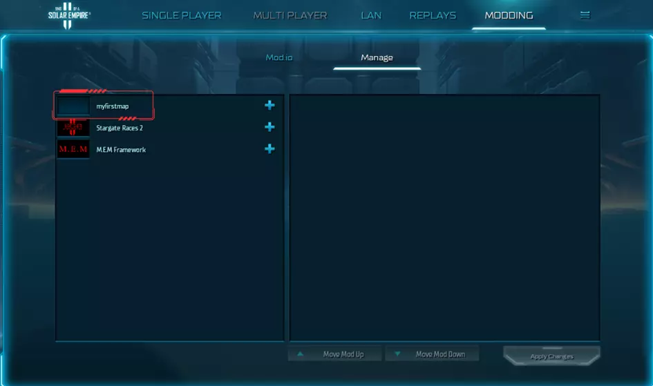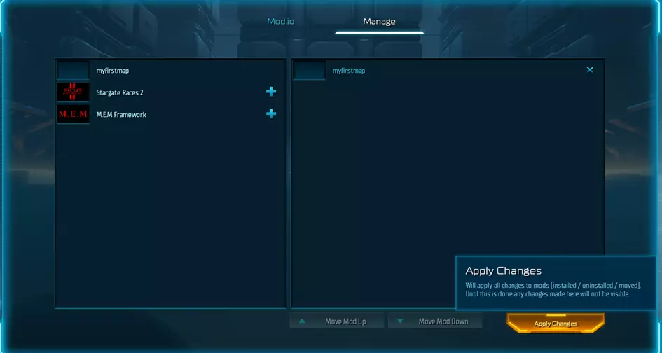 现在我们可以启动游戏并进入模组标签页。在“管理”中,我们应该能看到自己的模组!