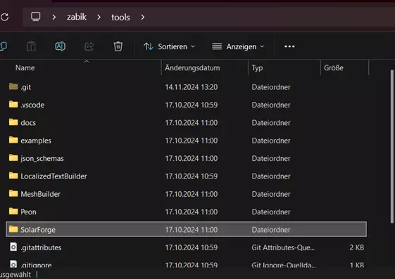 在此界面中,你还可以调整“Parent Folder”(父文件夹),即《Solar Forge》在你电脑上的存储位置。你也可以保持默认设置。 “Name”(名称)用于调整子文件夹的名称,工具将存储在该子文件夹中。 克隆完成后,程序会“pull”(拉取)所有文件,届时文件结构应与此类似: