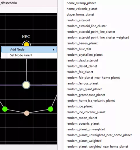 此界面可分为4个部分: ID 描述 1 通用场景信息,用于地图选择界面 2 所有星体列表 3 单个星体的属性 4 地图本身 添加行星——乐趣开始 我们将讨论上述截图中的各个功能,但我知道你迫不及待想要开始塑造银河地形了。那么,让我们添加一颗行星:为此,你需要在地图区域[4]中右键点击。 这将允许我们添加节点,随后会打开一个包含不同行星(和恒星)的下拉菜单。让我们从一颗简单的小行星开始。可以通过random_asteroid创建它。