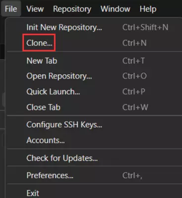 安装 Fork 后,点击“文件”->“克隆”。