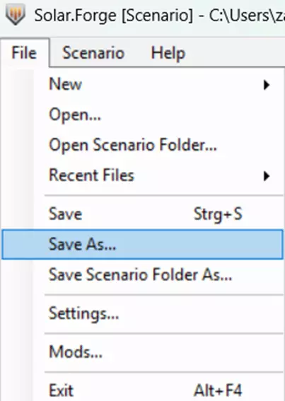 现在,请导航至 C: Users USERNAME AppData Local sins2 mods 创建一个文件夹,命名为“myfirstmap”。进入该文件夹后,我们需要创建3个子文件夹: 1) localized_text 2) scenarios 3) uniforms 导航至 localized_text 文件夹,创建一个名为 en.localized_text 的文件(你可以使用文本编辑器,通过“另存为”选项来创建,Notepad++ 会更合适)。 在该文件内添加以下内容: { "scenario.testmap.name": "First Map", "scenario.testmap.desc": "Map for testing" } 这将告诉游戏该地图的名称和描述信息。 现在导航至 uniforms 文件夹,同样创建一个名为 scenario.uniforms 的文件。在文件内添加以下行: { "scenarios": [ "myfirstmap" ], "fake_server_scenarios": [], "dlc_scenarios": [], "dlc_multiplayer_scenarios": [] } 现在导航至模组根目录(向上一级)并添加一个 .mod_meta_data 文件。在其中添加以下内容: { "compatibility_version": 2 } 现在返回《Solar Forge》,导航至“另存为”选项。