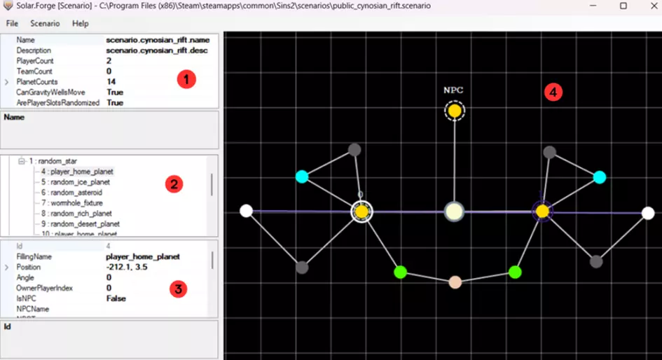 如果想要添加一个次要势力,还需遵循以下几个步骤: 1) 添加一个玩家母星(注意选择你希望次要势力所在的恒星,以便将其分配到该恒星系统)。 2) 选择新行星,并将其属性“IsNPC”设置为“True”。