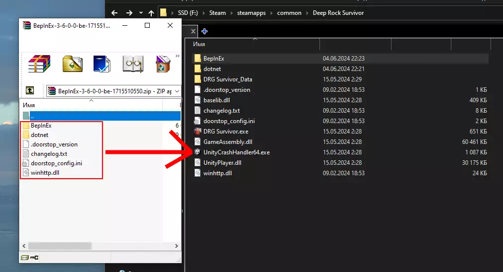 3. 将压缩包中的文件复制到游戏根目录(……Steam\steamapps\common\Deep Rock Survivor),即DRG Survivor.exe所在的位置。