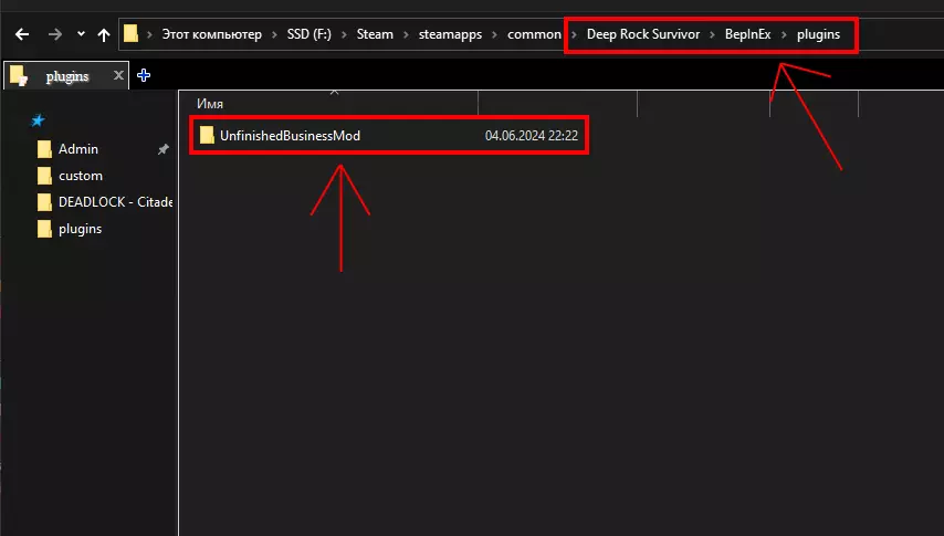 5. 将压缩包中的文件复制到游戏根目录下的BepInEx -> plugins文件夹中(路径示例:...Steam\steamapps\common\Deep Rock Survivor\BepInEx\plugins)