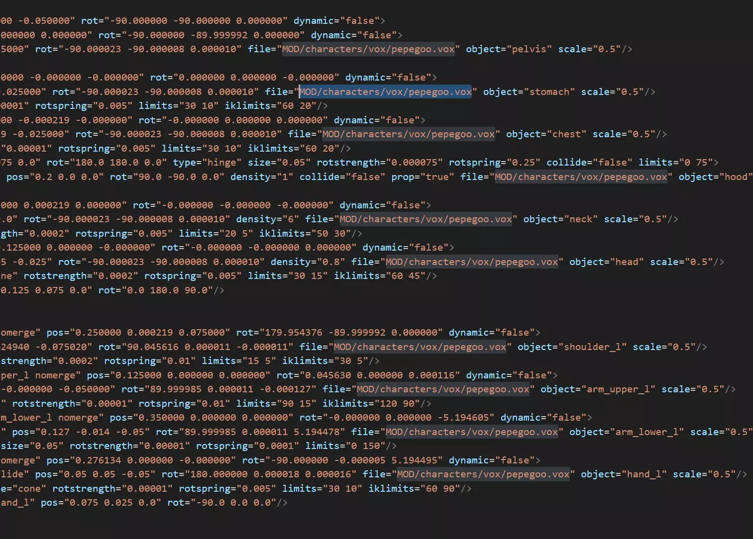 在输入模型路径时,不要混淆斜杠(即“/”和空格“ ”)。务必使用右斜杠“/”!在我的示例中,.xml文件的路径如下:MOD/characters/vox/pepegoo.vox。 太棒了!现在我们要进入最神奇的部分——编码。 ### 编写.xml文件 这部分非常重要!只修改我展示给你的内容,不要改动其他任何地方。请仔细阅读!为了更好地编辑文件,建议你下载Visual Studio Code[code.visualstudio.com],之后你就会明白为什么了。它可以同时修改多行代码。我们只需要更改模型(.vox)的路径。因此,在预制件(.xml)中,我们需要找到之前从《拆迁》Steam文件夹中获取的模型文件名(在我的示例中是:player/player_bjorn)。将其更改为我们文件的路径和名称(以我为例:MOD/characters/vox/pepegoo.vox)。 使用VS Code打开你的预制件(.xml文件)。找到你使用的模型文件名称(对我来说是player_bjorn.vox)。并且需要更改每一行[player/player_bjorn.vox]。