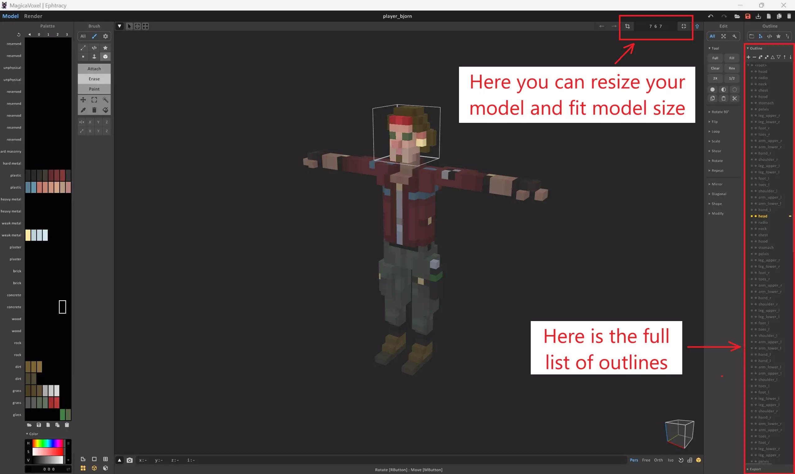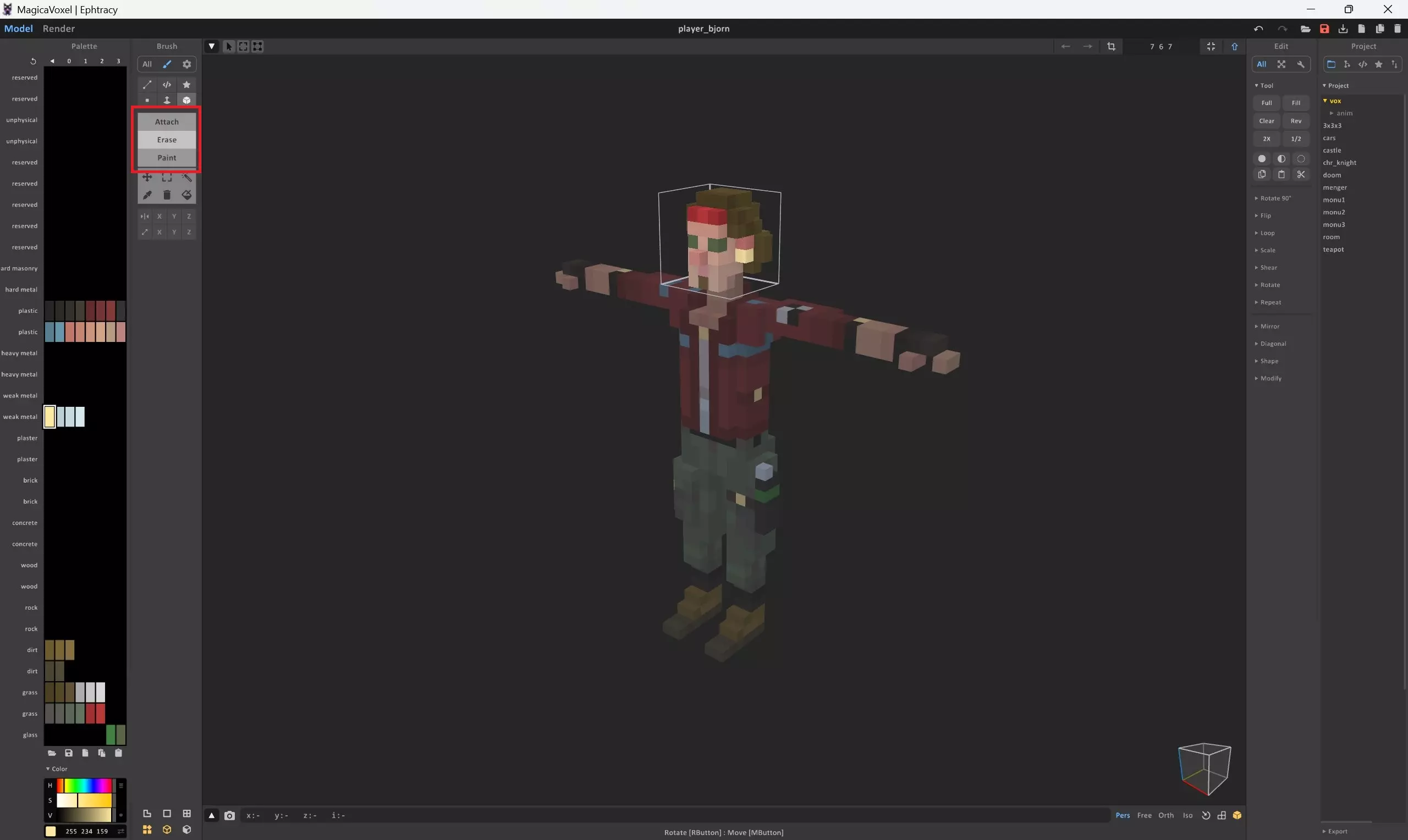 双击模型的部件(即轮廓线)开始编辑(再次双击退出)。“绘制”用于更改体素颜色,“擦除”用于删除体素,“附加”用于添加体素。
