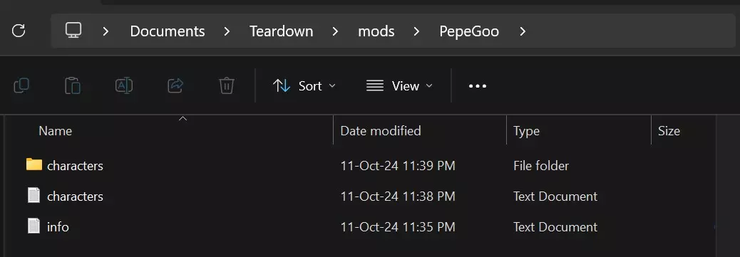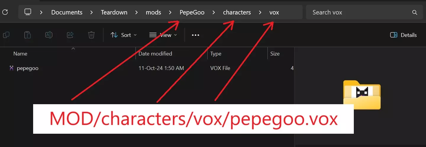 MOD的秘密 在本节中,我们将接触一个非常难以理解的部分。请务必留意并保持专注!只需知道,你的文件夹(存放角色或MOD的位置)始终被指定为MOD,而非你为其命名的名称。它可能有不同的名称,但对于游戏而言,它始终会被自动定义为MOD。记住这一点很重要。我们需要为模型获取正确的.xml文件路径,这样一切才能正常运行。 如图所示,我的MOD是PepeGoo(MOD = PepeGoo文件夹)。