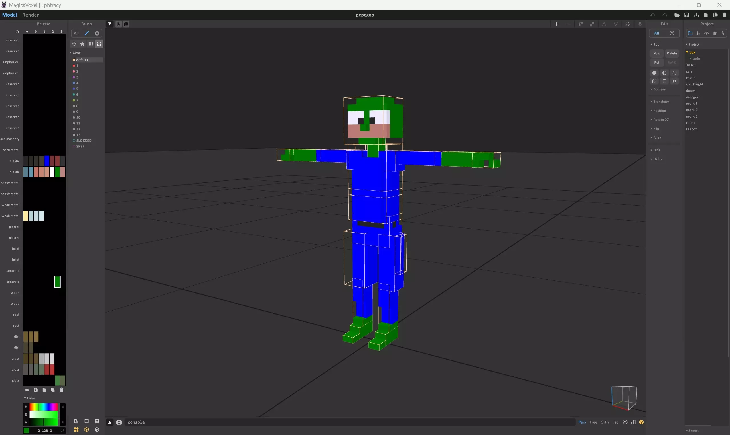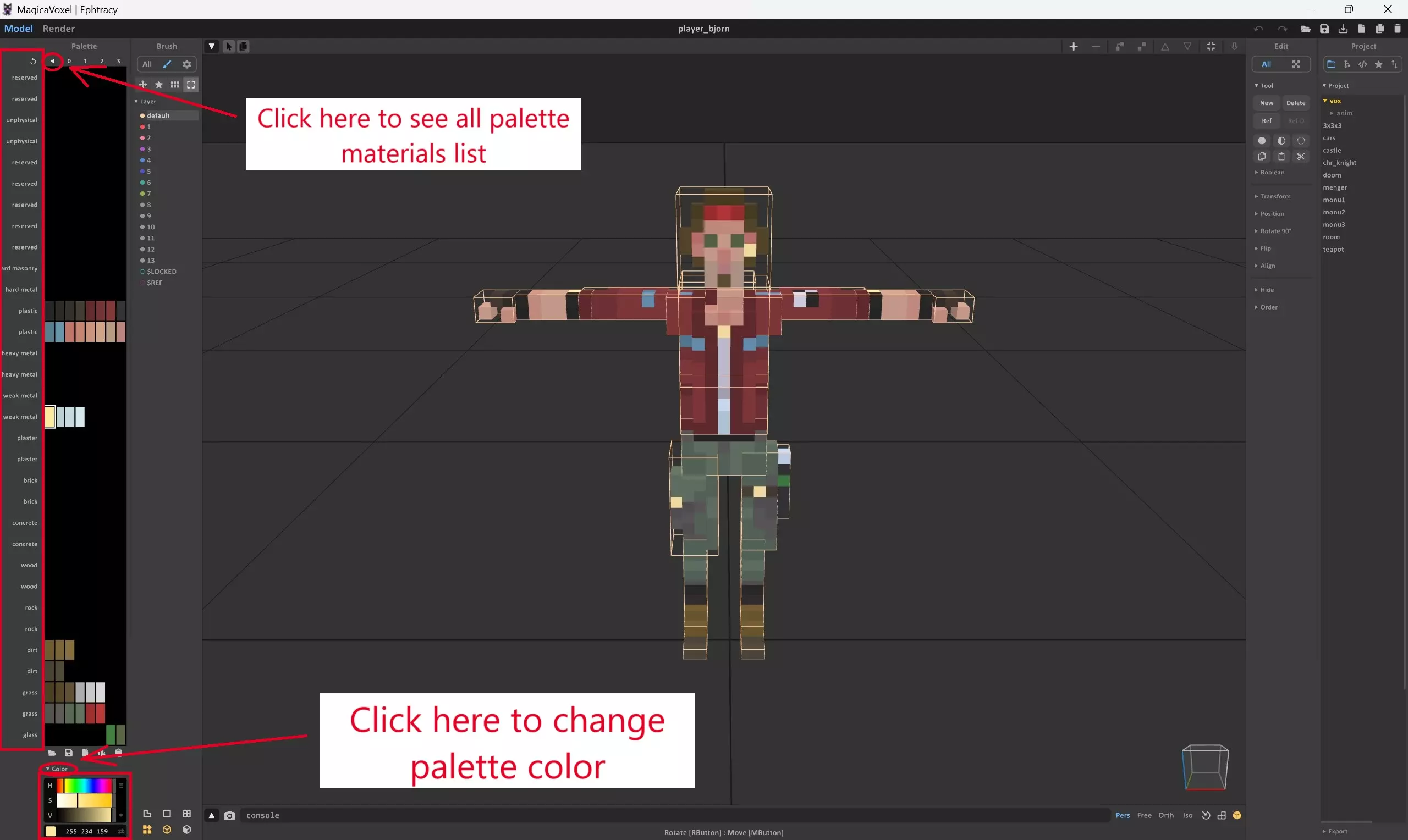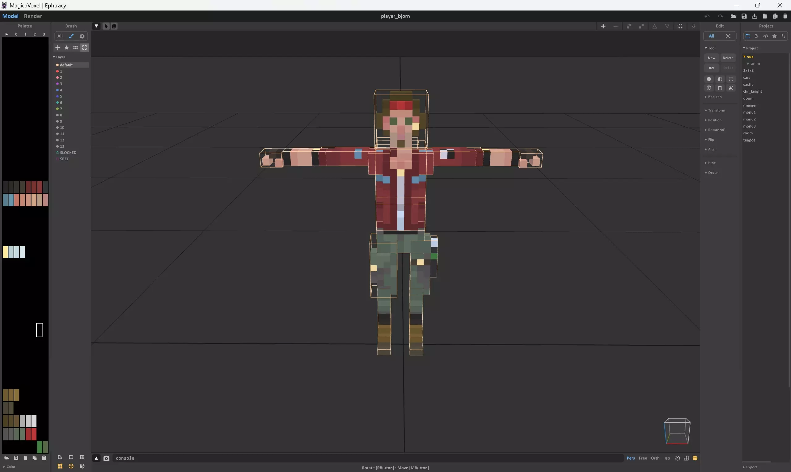 现在我们开始编辑模型! 在MagicaVoxel中编辑模型 !!!如果你知道如何使用MagicaVoxel,则无需阅读本文。本部分面向纯新手!!! 所有模型都可以在MagicaVoxel中创建和编辑。这是一款非常简单易懂的程序。你可以在此处下载该程序: 获取MagicaVoxel![ephtracy.github.io] 最好在Youtube上观看一些教程,资源非常多。不过这里我只想向你展示一些立即编辑角色的简单步骤。使用MagicaVoxel打开.vox模型,现在我们开始编辑。 这是主屏幕。你可以使用鼠标右键(RMB)旋转角色,使用鼠标中键(WMB)移动空间。