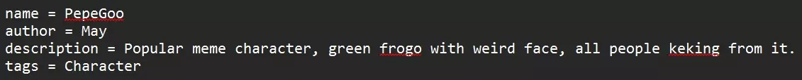 info.txt 此文件用于将你的角色添加到列表中。你可以创建一个内容为空的 info.txt 文件,它仍然可以正常工作,但该文件必须存在!这是所有模组都需要的标准文件。 如果没有 info.txt 文件,你将无法在游戏中看到你的角色模型! **以下内容适用于希望填写 info.txt 文件的用户。** 默认情况下,info.txt 文件格式如下: name = "你的模组名称" author = "你" description = "在此处填写内容" tags = "Asset, Map, Vehicle, Tool" 以下是我在自己的 info.txt 文件中的填写示例。