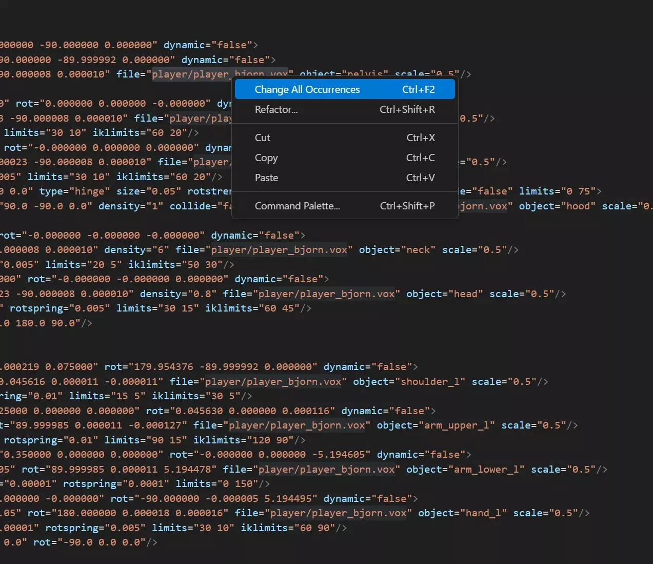 复制模型的完整路径,例如:MOD/characters/vox/pepegoo.vox。现在在VS Code中,选中文本(player/player_bjorn.vox)以及.vox扩展名,注意不要选中引号。如图所示!点击“更改所有匹配项”(或按Ctrl+F2)。