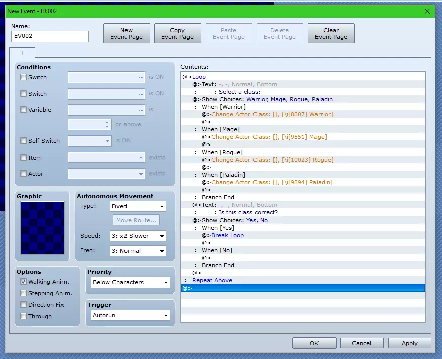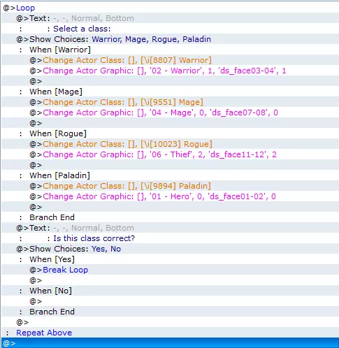 关于以这种方式更改职业的注意事项:有时,如果该职业包含1级习得的法术或技能,该技能可能不会在游戏中显示。若要解决此问题,请将其改为2级习得。 更改角色外观 角色已命名并分配职业,接下来该做什么? 当然是更改其外观。有两种方法可以实现: 让角色根据其职业自动更改外观, 或者允许玩家自行选择。 如果打算让玩家选择外观,那么应该在职业选择循环之后再创建一个“显示选择项”命令循环。无论采用哪种方式,你需要使用的命令都是“更改角色图像”,该命令位于第3选项卡的“系统设置”下。 如果让事件自动选择外观,那么你的事件现在应该如下所示: