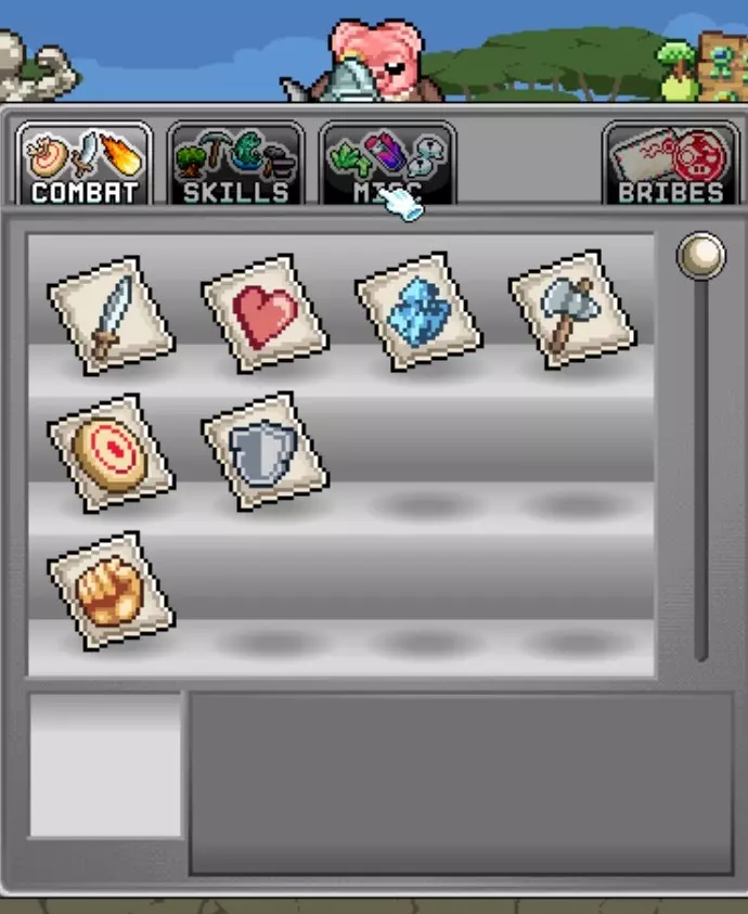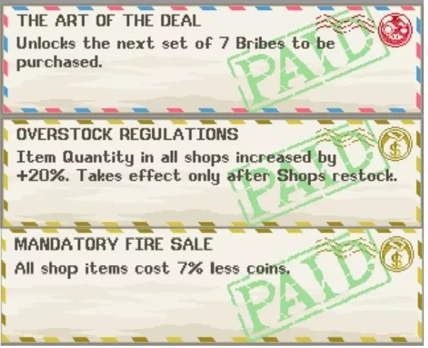 存钱罐先生——将任意邮票交给这个NPC。收集邮票并在商店购买后,可通过多种方式提升角色能力。这些是对所有角色生效的全局增益,因此请用金币尽可能购买升级。使用资源可提高它们的等级上限。每种邮票只需一个,因此只要在任意角色身上获得并上交后,就可以出售重复的邮票。你还可以用金币购买“贿赂”道具来帮助你推进游戏。我强烈建议尽早获取尽可能多的邮票,尤其是如果你想成为熟练玩家,那些增加商店库存和降低价格的邮票。离线经验率也是另一个需要尽快获取的优秀邮票。