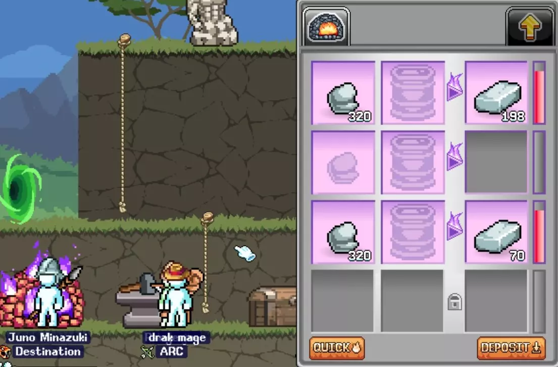 铁砧 - 用于制作装备并随时间产出少量资源。要始终保持生产状态。即使不在铁砧旁,你也可以访问并快速将物品存入宝箱,因此只需返回城镇时使用铁砧进行制作或更改生产内容即可。从宝石商店购买“无限 hammer”升级,即可同时进行2个物品的制作。