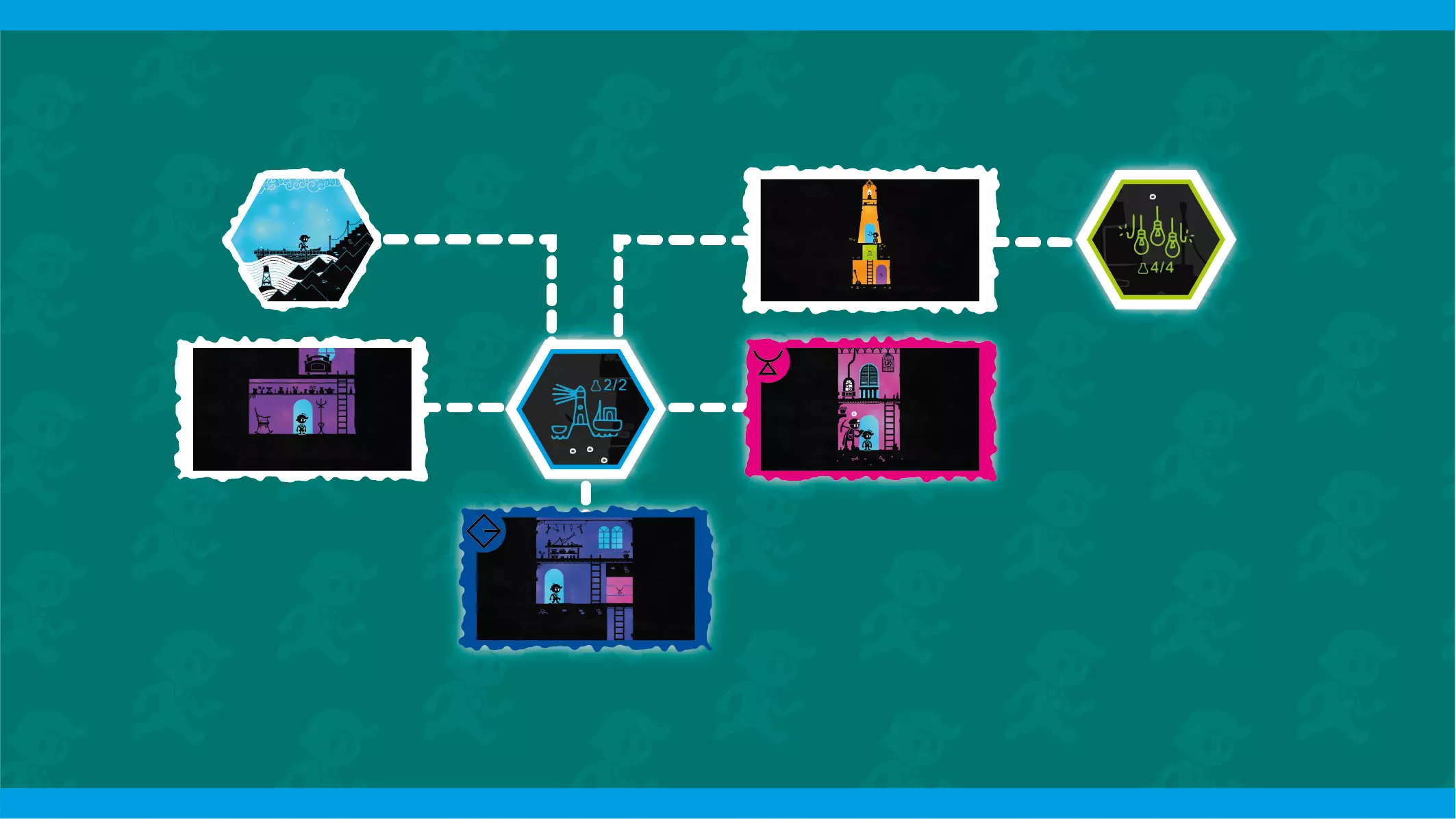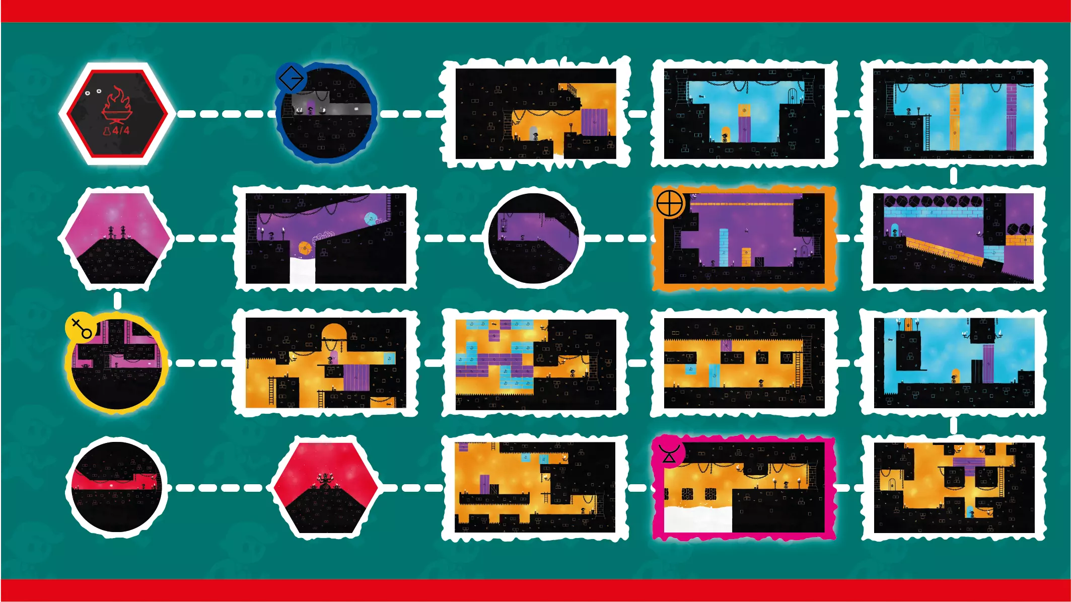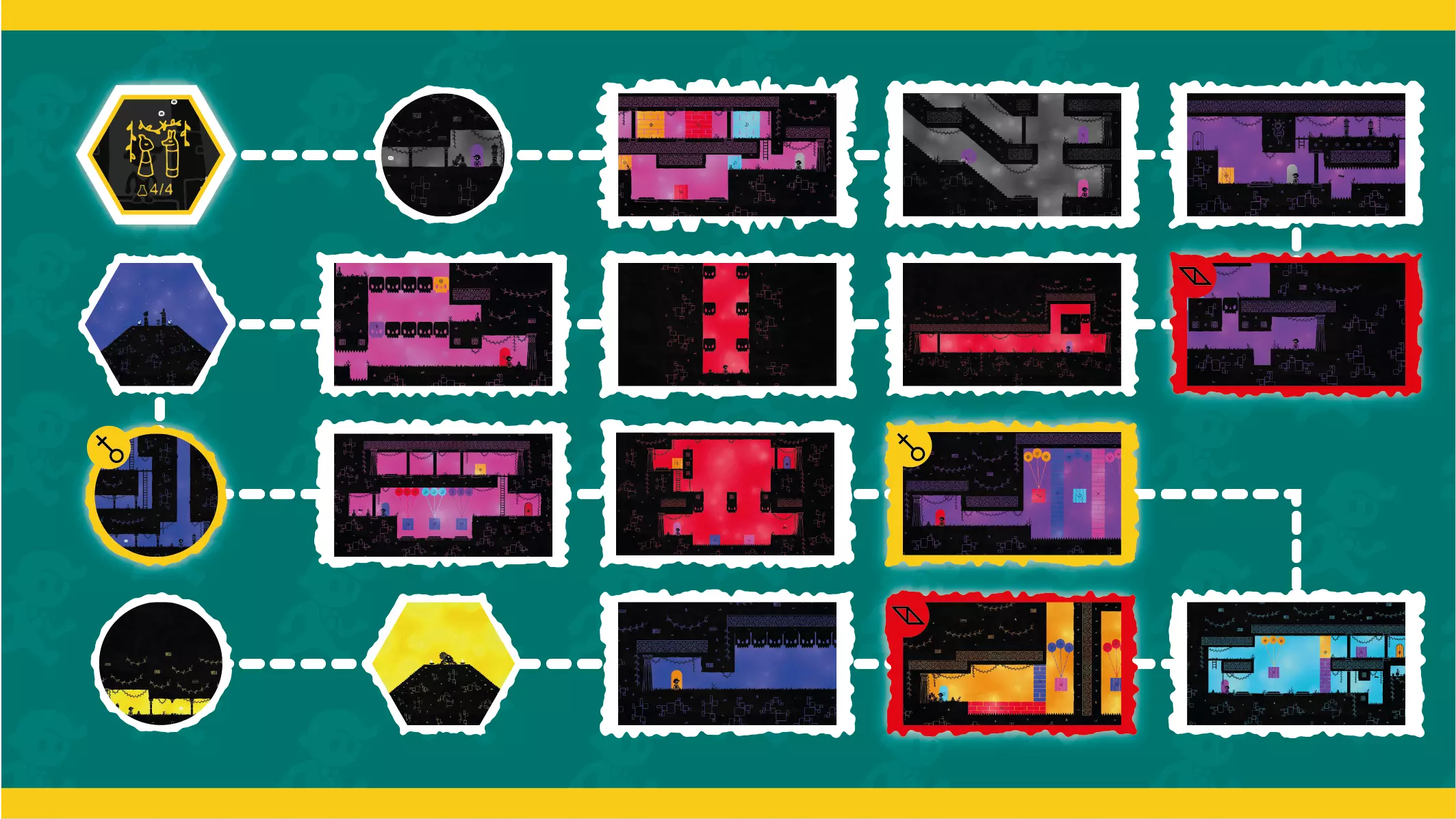 与“《色彩之旅》全区域地图”不同,本指南的地图会显示每个区域中所有秘密烧杯的所在房间位置,同时仍保留让你自行在房间内寻找烧杯的乐趣。如果仍然遇到困难,指南末尾提供了所有28个烧杯的视频攻略。 你可以使用游戏内的地图功能快速返回各个区域收集烧杯(不过,地图上无法选择区域内的具体房间,因此你需要再次逐个通过已完成的房间)。收集完某个区域的最后一个烧杯后,使用地图快速离开该区域(无需再次通过所有关卡,以节省时间)。游戏会在你收集到烧杯后立即保存,即使你在到达门口前死于关卡中也不影响。地图 - 总体概况