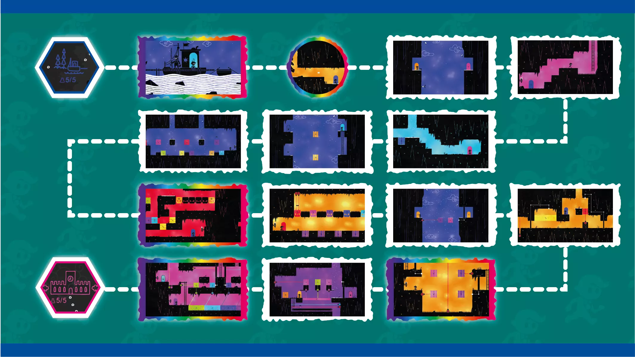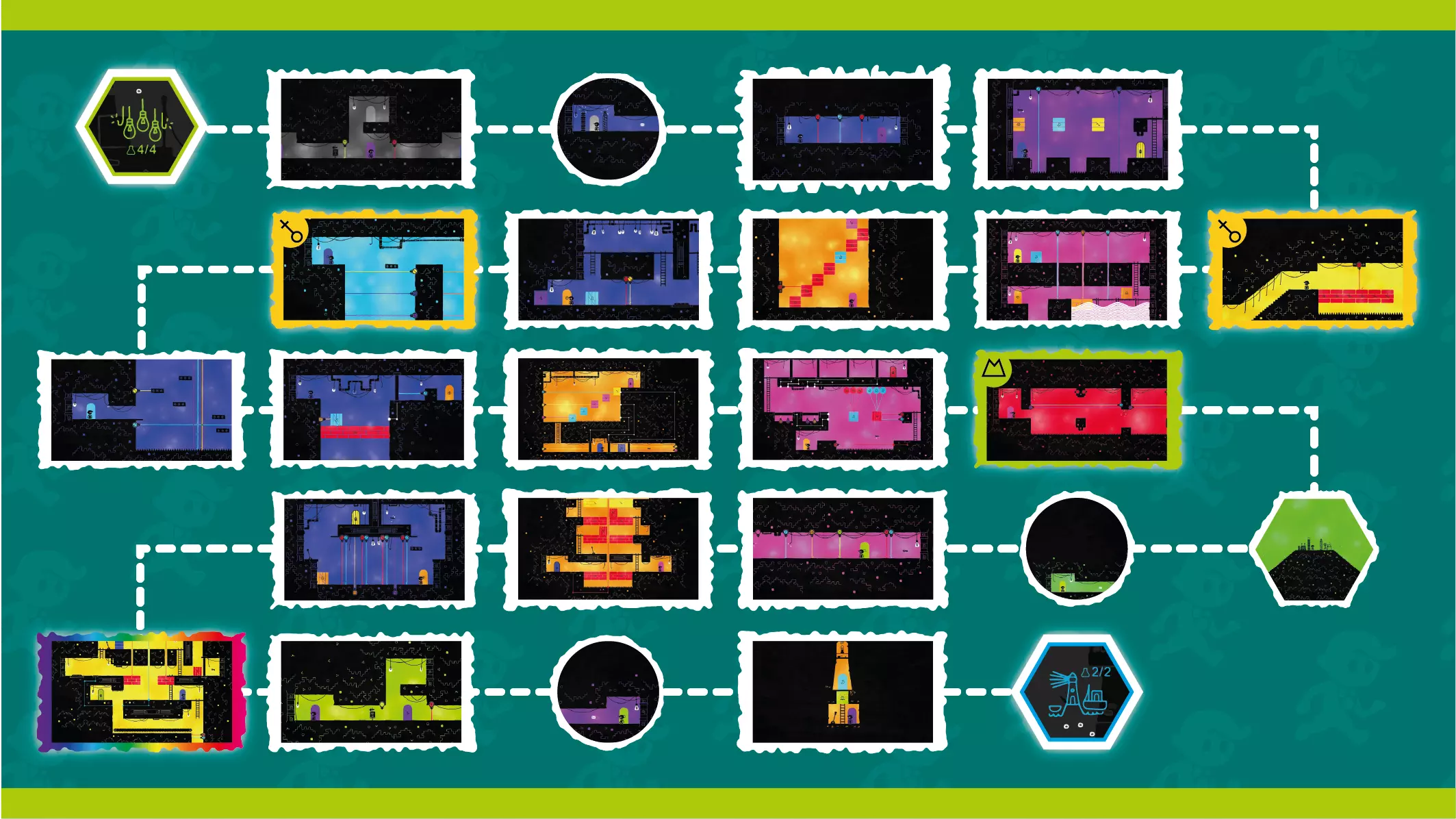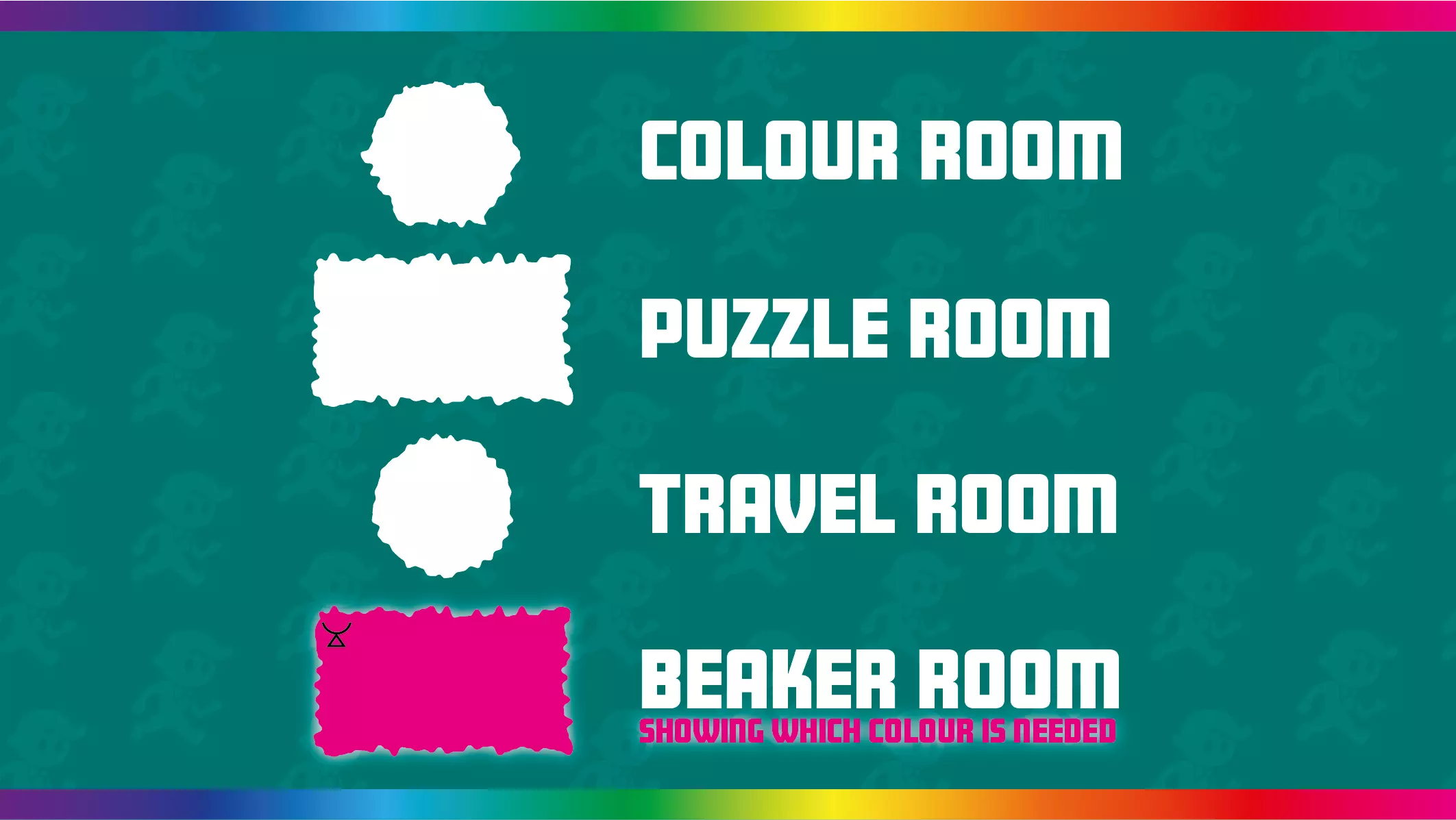 颜色房间 - 你可以在此为色轮选择颜色的房间。 解谜房间 - 你必须解开谜题才能到达另一扇门的房间。 移动房间 - 你只需通过奔跑、跳跃或攀爬到达另一扇门的房间,通常会有字母过场动画。 烧杯房间 - 可以找到秘密烧杯的房间(可能是解谜房间或移动房间)。房间的高亮颜色表示你需要何种颜色才能进入秘密区域。彩虹高亮代表在你收集所有颜色后出现的烧杯房间。 各适用区域的颜色收集