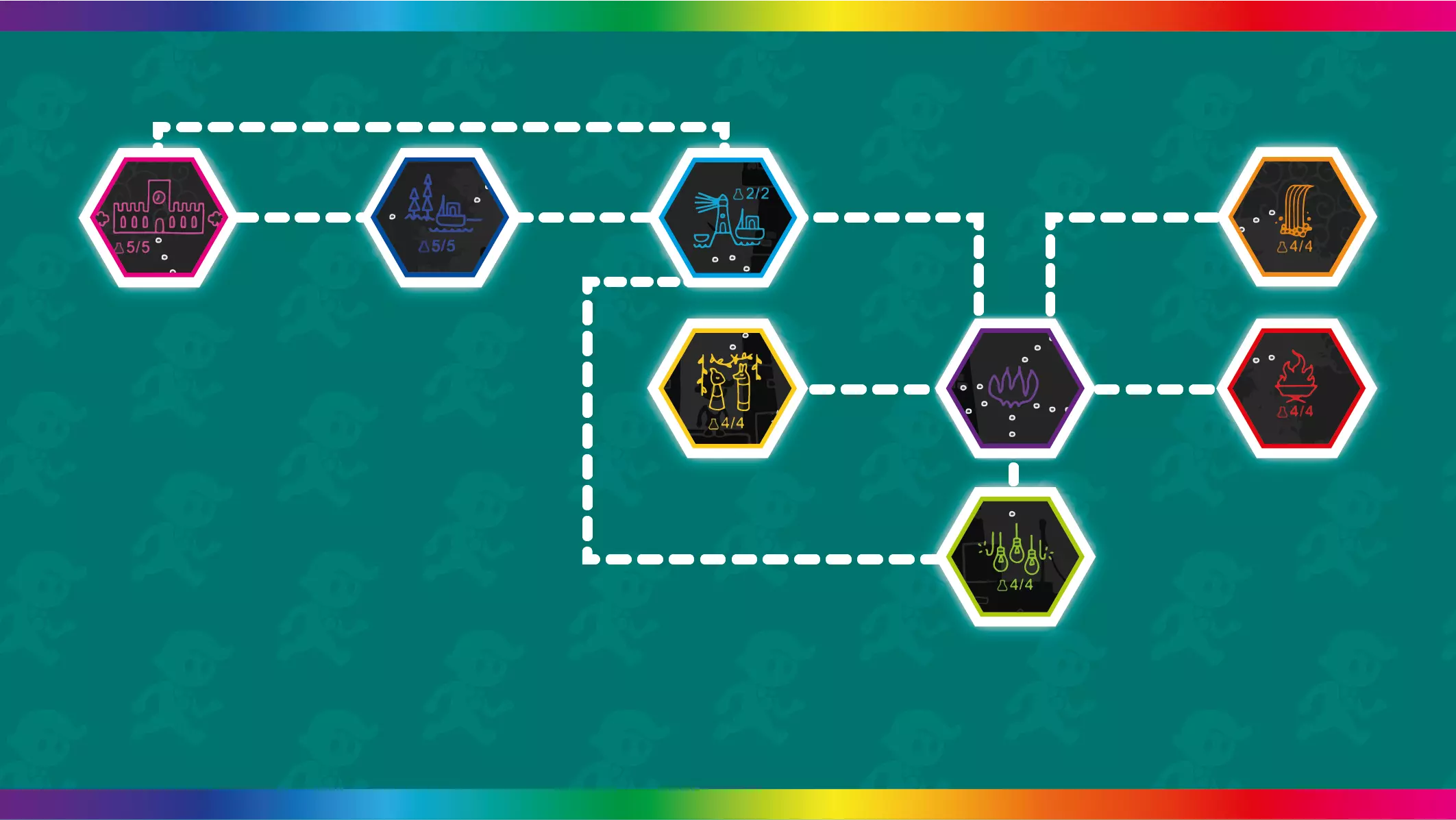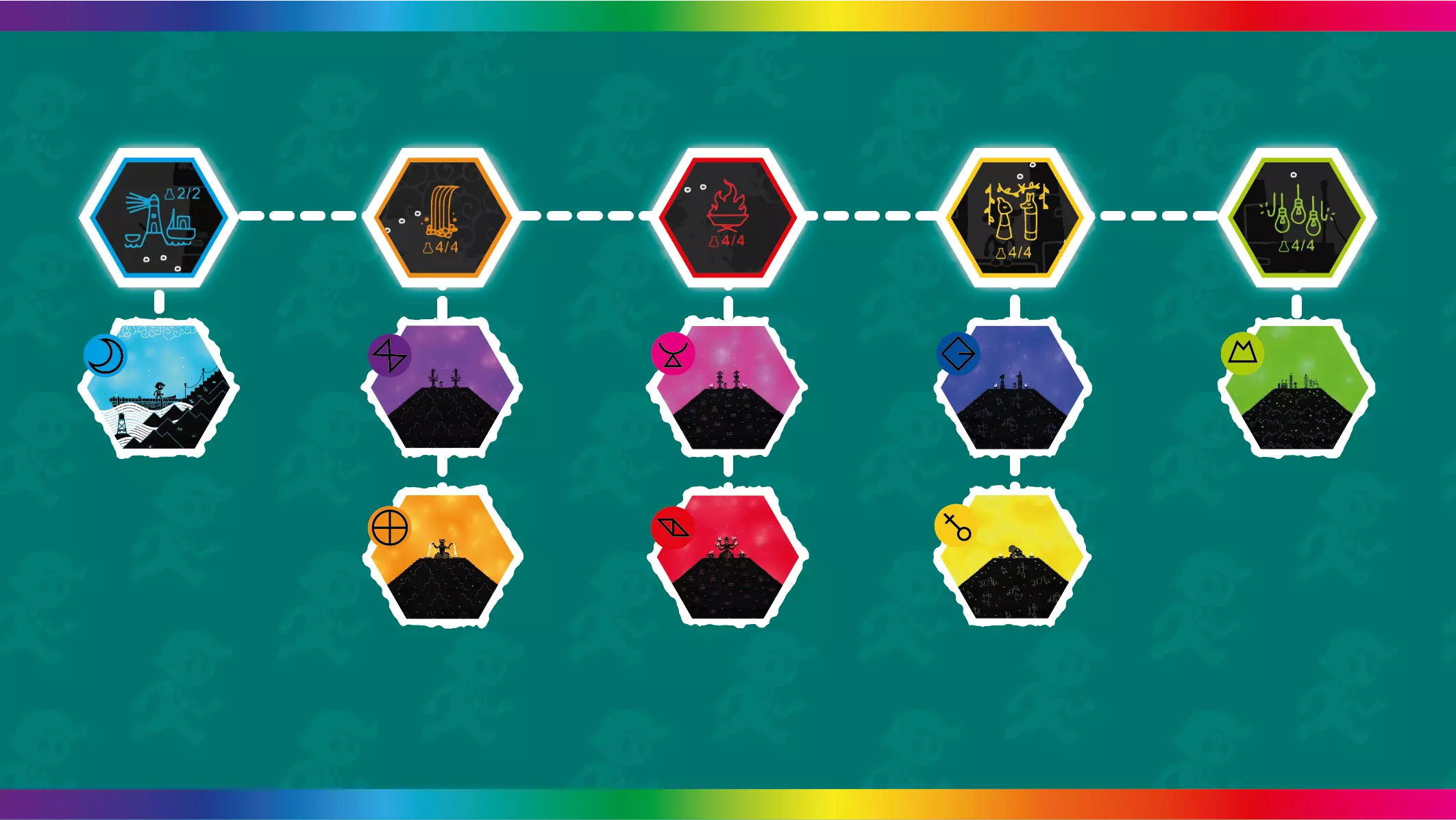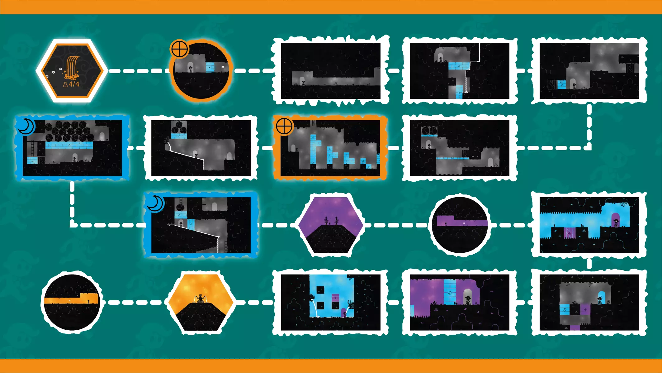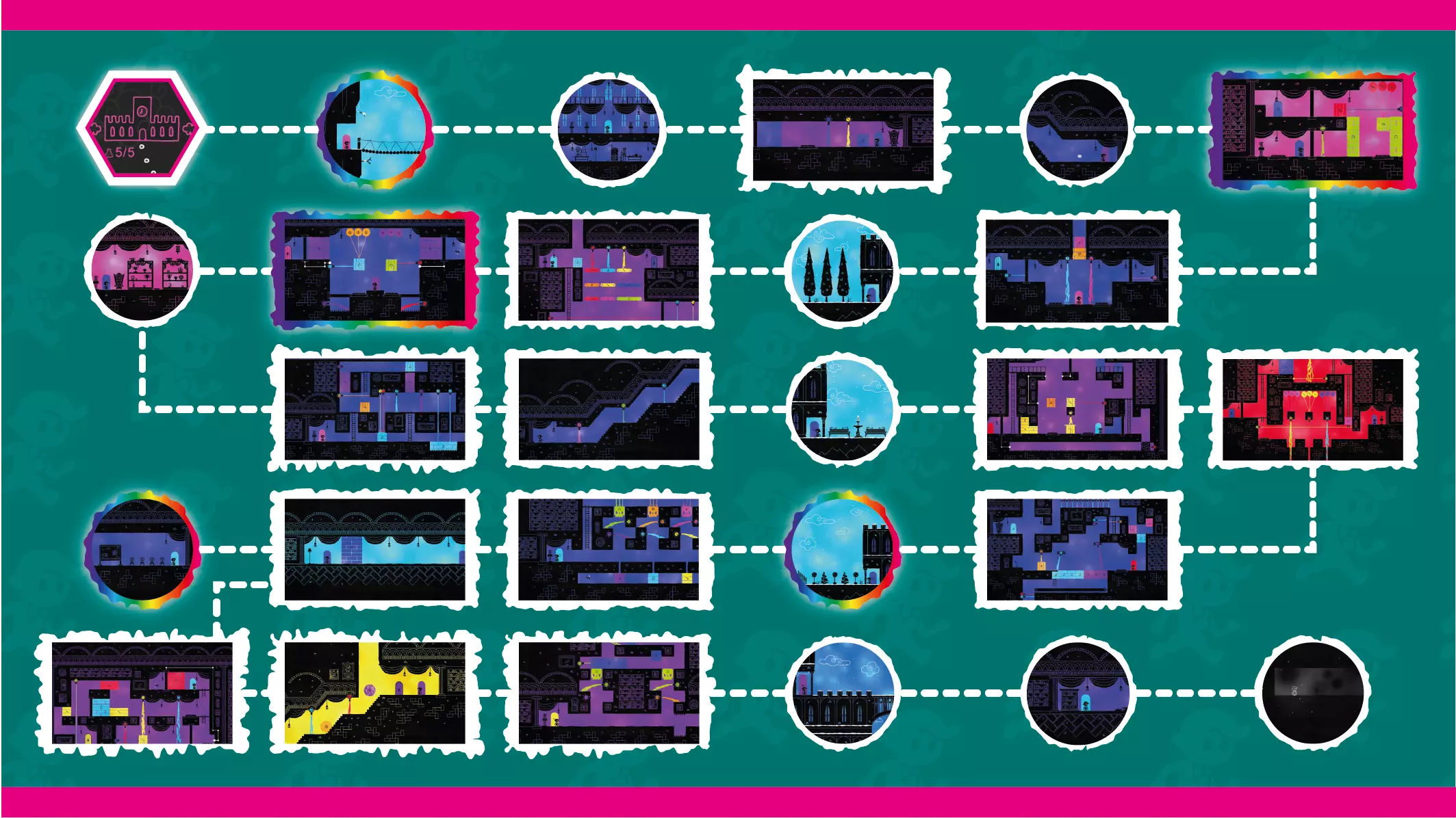 颜色房间 - 你可以在此为色轮选择颜色的房间。 解谜房间 - 你必须解开谜题才能到达另一扇门的房间。 移动房间 - 你只需通过奔跑、跳跃或攀爬到达另一扇门的房间,通常会有字母过场动画。 烧杯房间 - 可以找到秘密烧杯的房间(可能是解谜房间或移动房间)。房间的高亮颜色表示你需要何种颜色才能进入秘密区域。彩虹高亮代表在你收集所有颜色后出现的烧杯房间。 各适用区域的颜色收集