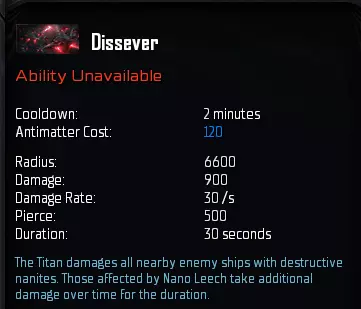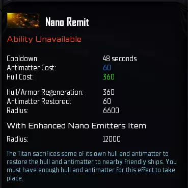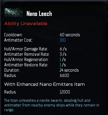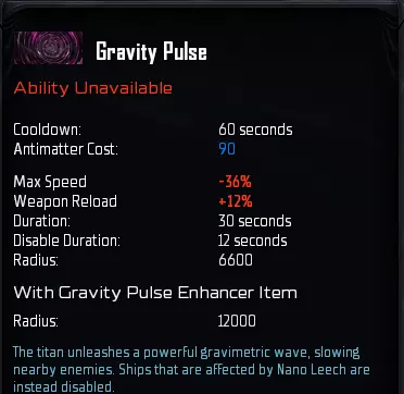 “纳米水蛭”是你的主要战斗技能。它会释放纳米机器人,穿透附近所有敌方舰船的船体,每命中一艘舰船,你的泰坦都会获得治疗并恢复反物质。不过,只有当范围内存在拥有反物质的舰船时,该技能才会恢复反物质,否则将仅提供治疗效果。 1级时的治疗量仅勉强能抵消钴蓝护卫舰的每秒伤害,但由于该技能会对范围内的每一艘敌方舰船都产生治疗效果,因此其治疗量会随着敌方舰船数量的增加而显著提升。 此技能的主要作用是造成伤害,但如果想获得最佳治疗效果,你应该在护盾消失但装甲值尚未耗尽时激活该技能,这几乎能让技能的实际治疗效果提升两倍。此技能与我们稍后会介绍的重力脉冲(Gravity Pulse)有协同效果。现在提及这一点是为了强调为何纳米虹吸(Nano Leech)是你的主要技能。最后,纳米虹吸可以通过模块进行升级,该模块能将技能范围再增加1000单位。这听起来可能不多,但要记住我们讨论的是半径,这意味着额外的1000单位将使你能覆盖的区域面积增加约36%。该模块位于军事科技树的第5级,因此是一项成本较高的物品,但在游戏后期,你将面对庞大的舰队,届时你肯定能充分利用这件物品。