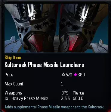 不过,考虑到库尔托拉斯克在舰队中扮演的角色,真正的MVP其实是相位导弹发射器模块。该模块能使你的导弹武器伤害提升至三倍,而且别忘了,导弹本身就拥有高额穿透,这让库尔托拉斯克在对抗主力舰和泰坦时表现出色。 没错,导弹确实容易受到点防御系统的拦截,但你拥有的导弹数量越多,敌方就越难将其全部击落。更何况这些是相位导弹!这意味着它们还能无视护盾,直接对船体造成伤害。这使得敌方的护盾爆发技能效果大打折扣。由于瓦萨里联盟在相位导弹技术方面独具优势,你甚至可能遇到在敌方舰船护盾尚未被耗尽之前就将其摧毁的情况!