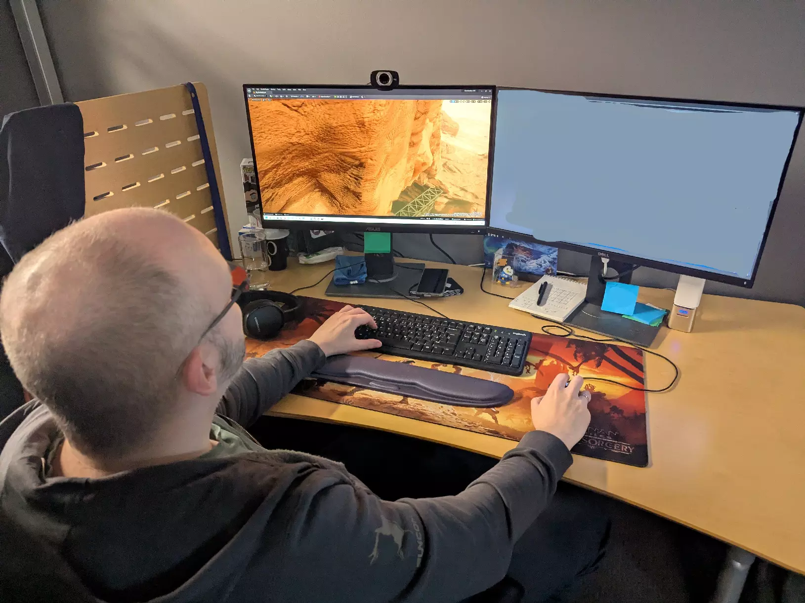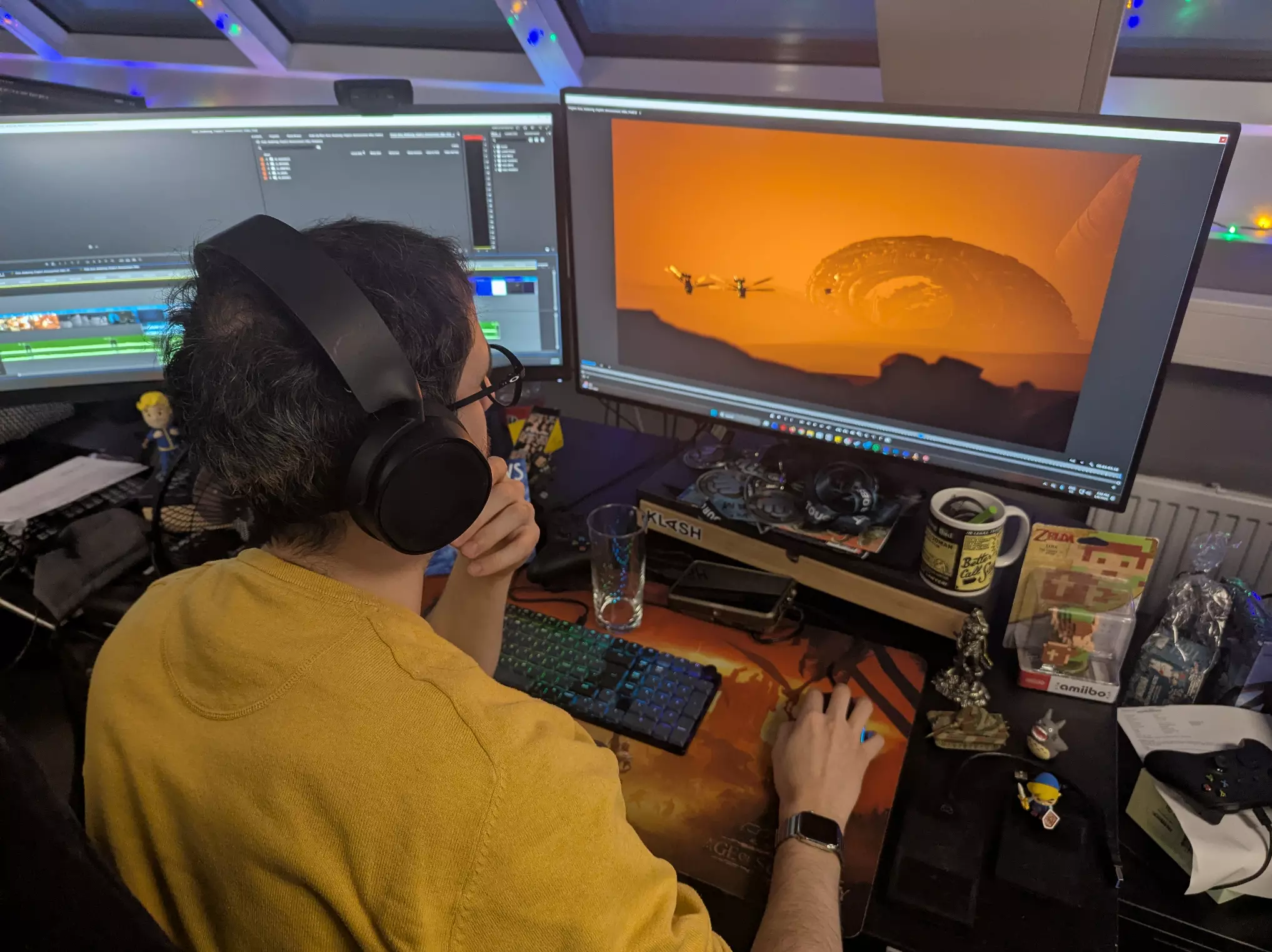 这是视频编辑胡安·洛佩斯·莫雷诺在他熟悉的工作环境中。他是《沙丘:觉醒》许多你所见过的视频和预告片的重要参与者。和Funcom的许多同事一样,我们都喜欢用小饰品装饰自己的办公桌。你或许能看到一些眼熟的东西!