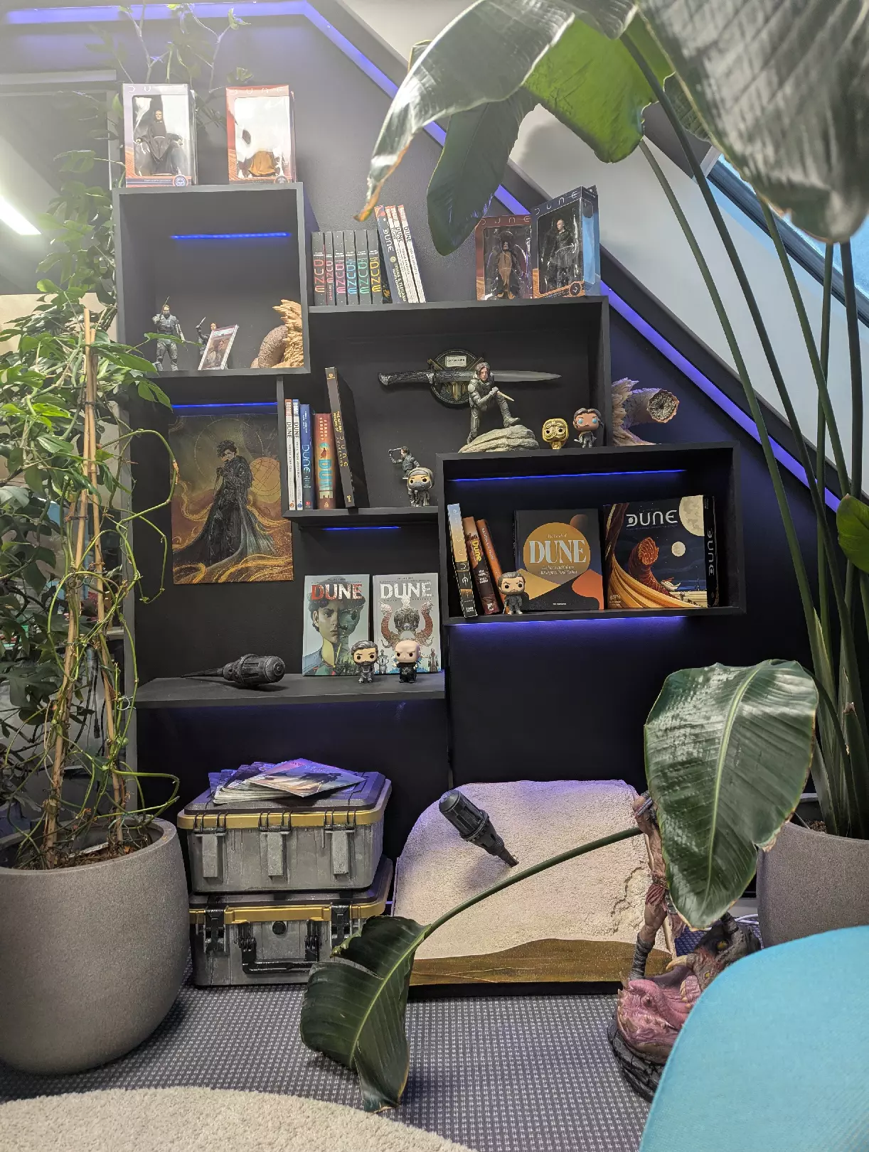 这是我们多年来收集的众多《沙丘》纪念品中的一面展示墙。我们收藏了人偶、海报、书籍、迷你扑翼机,甚至还有一个可以上下活动的扑击器。