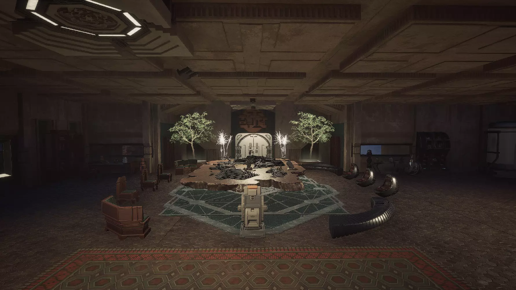 一张《龙与地下城》的桌游桌,中间摆放着地下城主的椅子。桌子两侧各有3名玩家的座位,可供厄崔迪家族和哈克南家族在棋盘上谋划下一步行动。由Discord用户Piegusek创作。