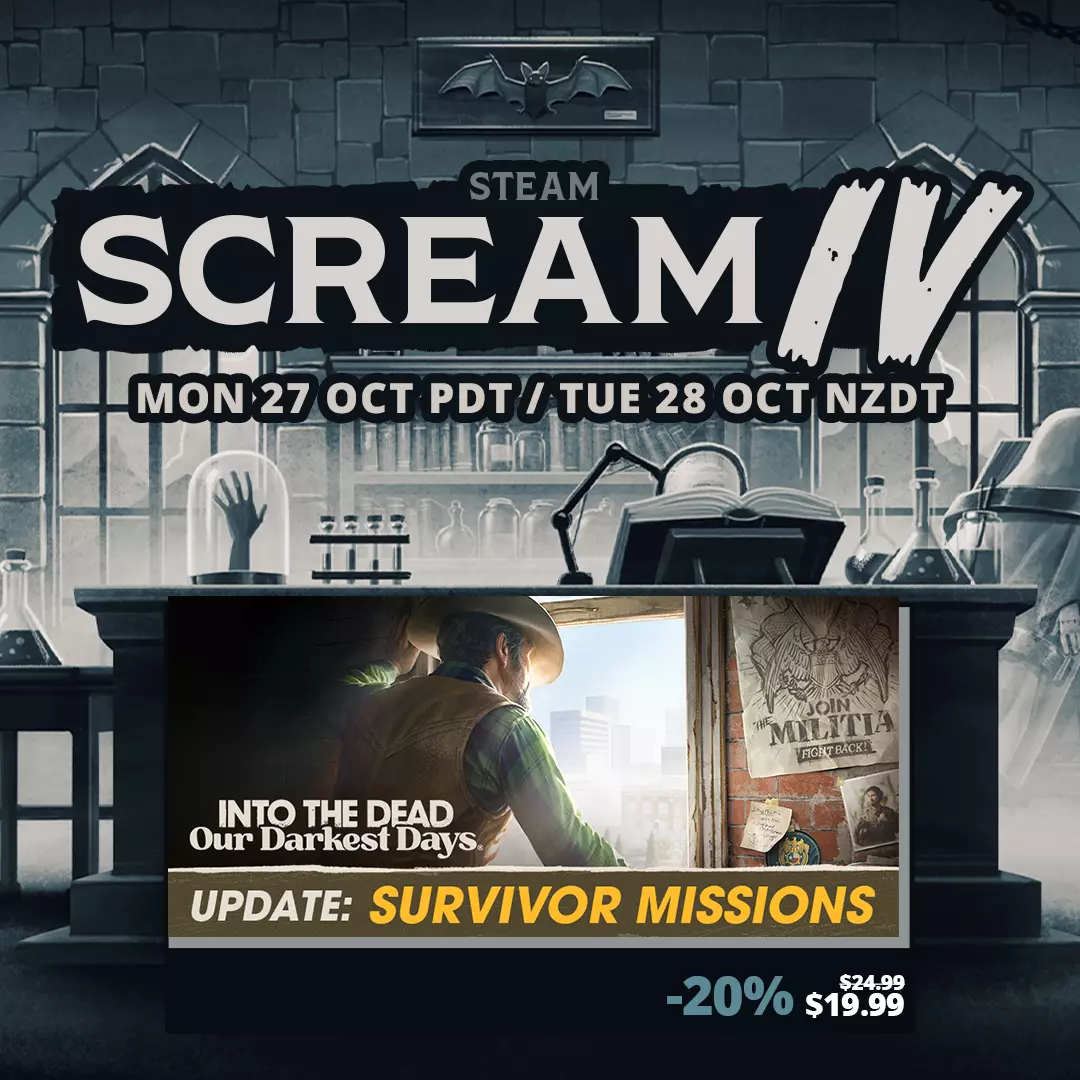 《Steam Scream IV》更新内容 Early Access Update #5即将在四天后发布!本次更新正值万圣节临近,将为大家带来以下全新内容: 1. **首批幸存者任务** 2. **全新初始角色组合** 3. **多轮游戏进度保存功能**