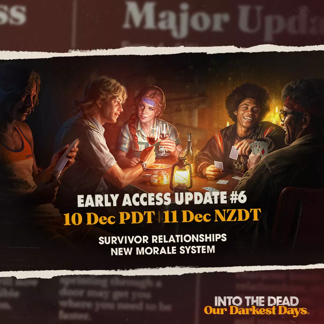 各位玩家,这是本年度的最后一次更新! 这么说感觉有点不可思议。 抢先体验版更新#6将为大家带来幸存者关系系统以及全新的士气系统。我们为此已经准备了很长一段时间,迫不及待想与大家分享。 本次更新将于新西兰惠灵顿时间12月11日(星期四)下午1点左右发布,其他地区时间如下: - 太平洋标准时间:12月10日(星期三)下午5点 - 美国东部时间:12月10日(星期三)晚上7点 - 欧洲中部时间:12月11日(星期四)凌晨1点 - 中国标准时间:12月11日(星期四)上午8点 - 澳大利亚东部夏令时间:12月11日(星期四)上午11点