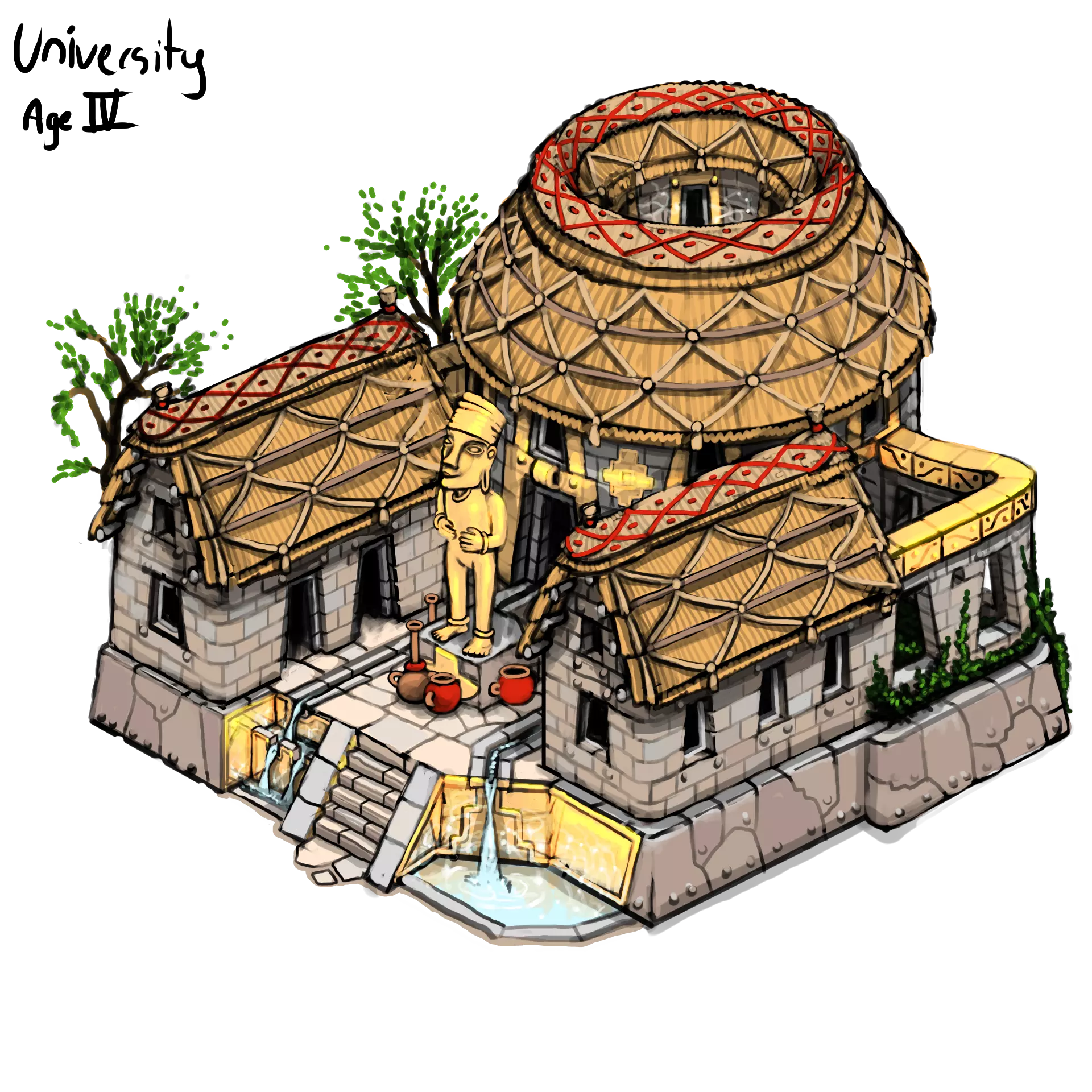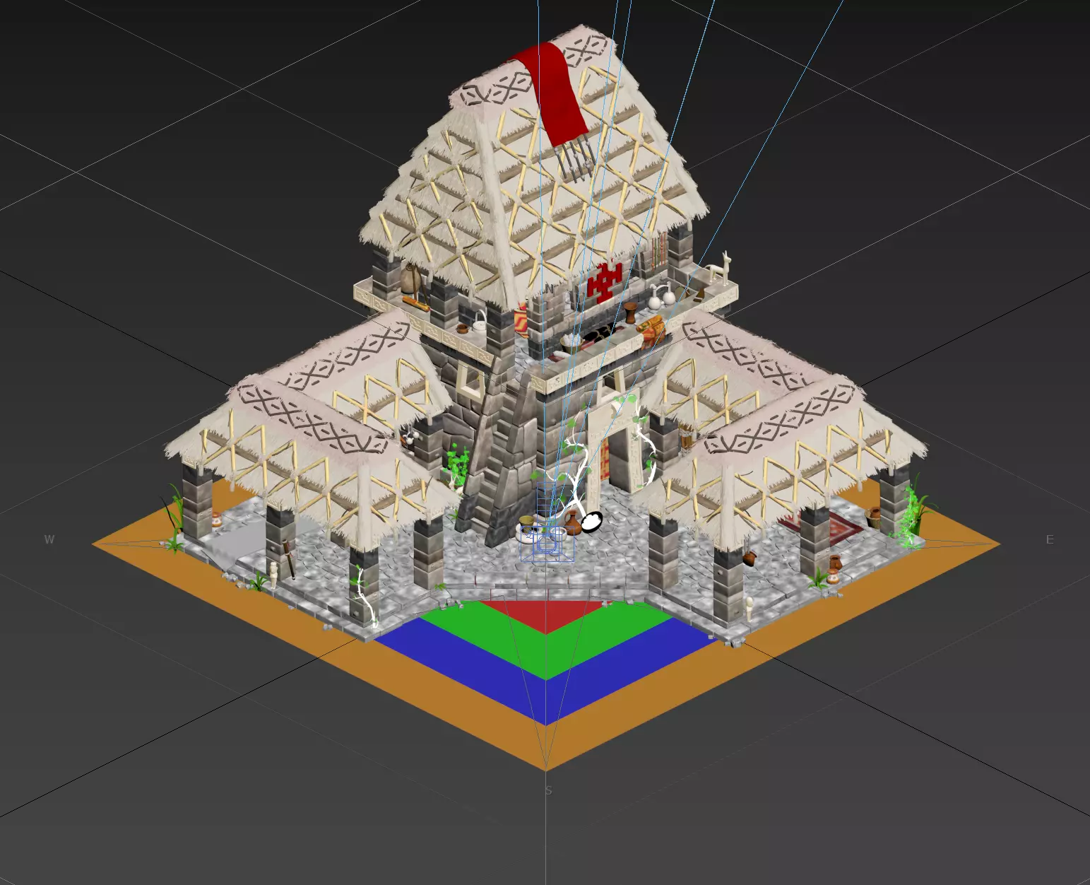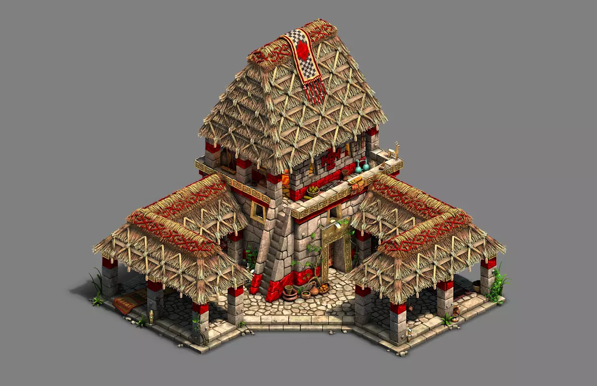 帝国时代城镇中心试点模型 克里斯(3D美术师) 我首先为安第斯文明套装制作了试点模型,作为团队其他成员的基准。其中最大的挑战之一是让3D茅草看起来恰到好处。游戏中的自动阴影系统往往会使密集区域显得过于昏暗。我们必须付出额外努力来微调光照和阴影,以确保屋顶纹理呈现出理想效果。 另一个棘手的部分是黄金装饰。为了让它们真正闪耀并脱颖而出,我们添加了一个额外的光源,该光源仅影响这些细节,为它们赋予了浓郁的金色光泽。 安卡(3D美术师)