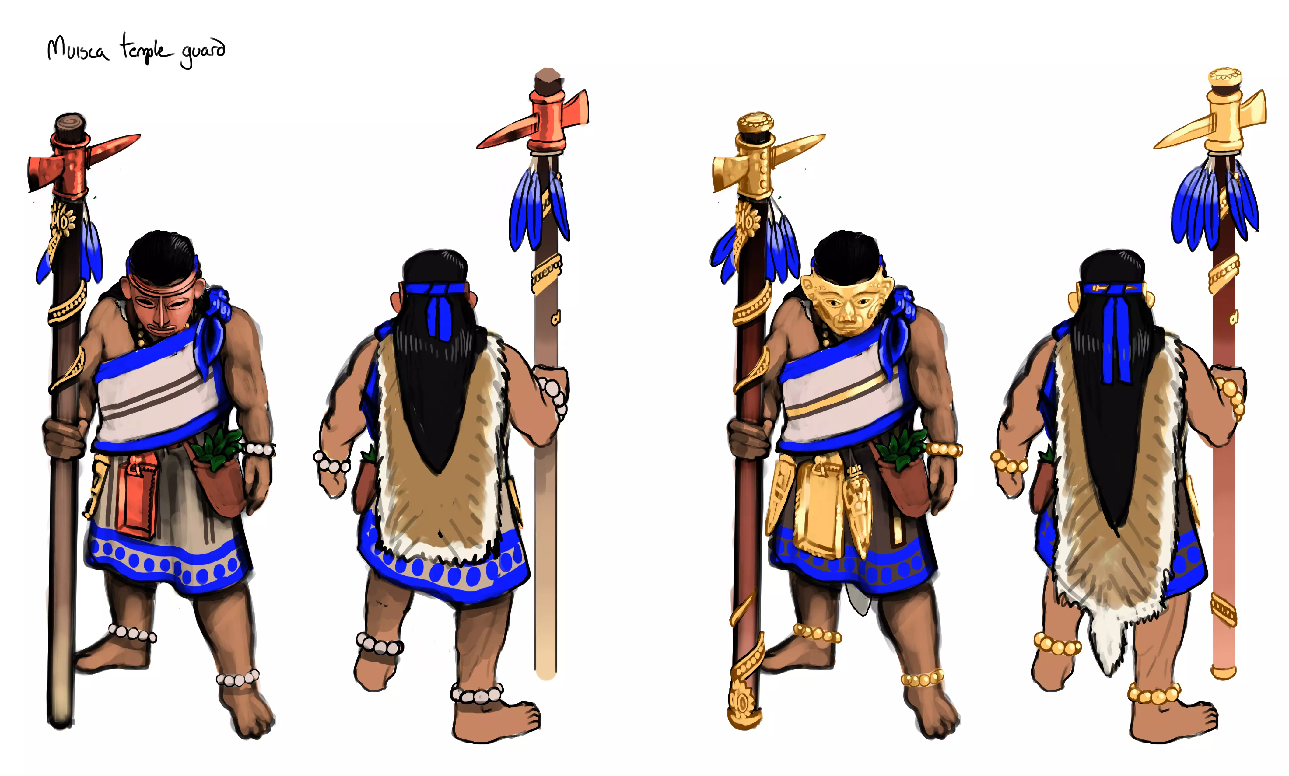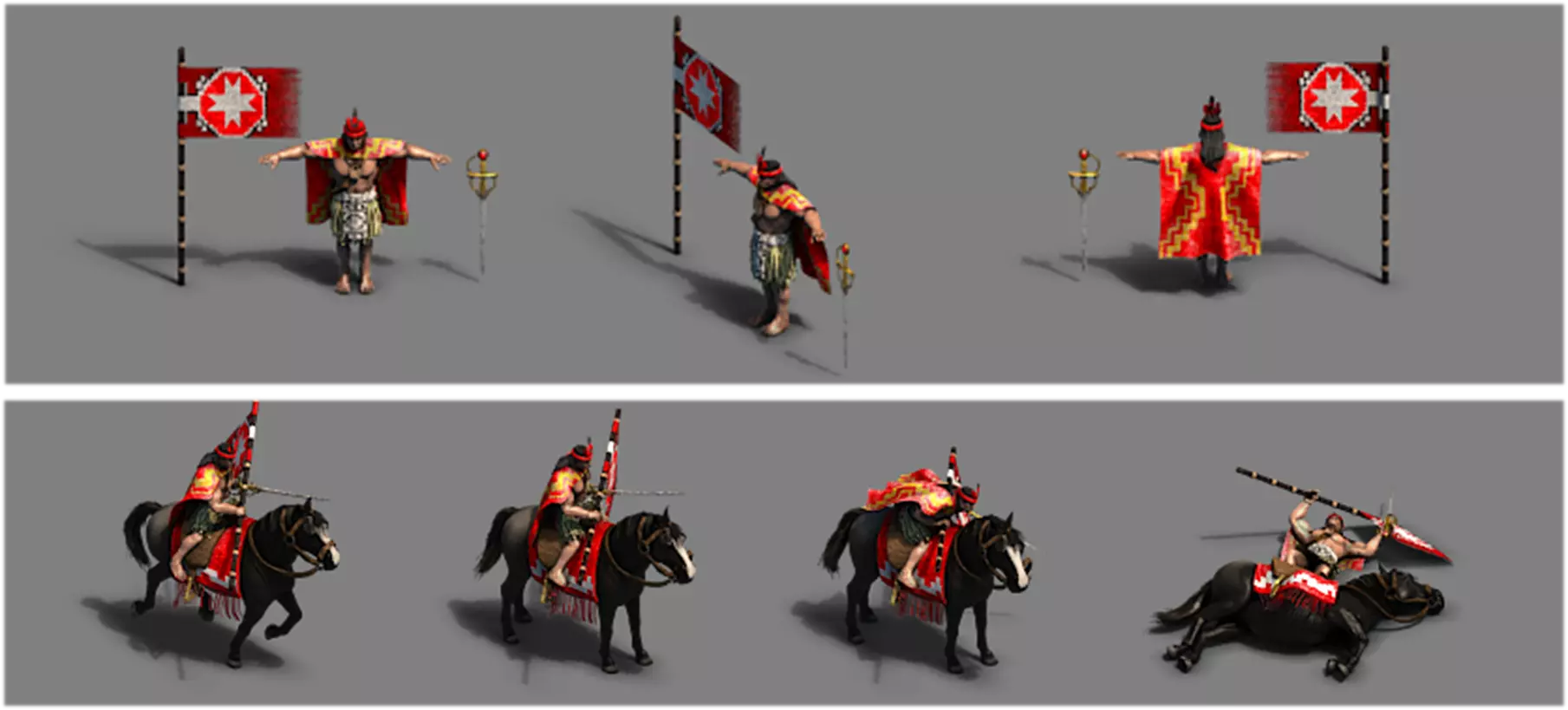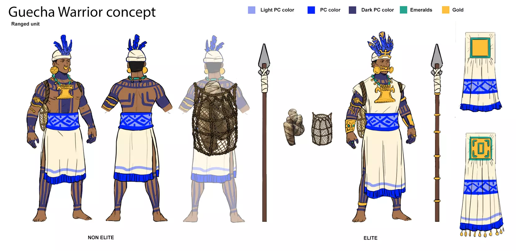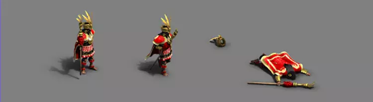 瓜科达——战役英雄 3D美术师 茵玛 参与这些单位和建筑的制作是一次令人耳目一新的体验,因为它们与我们之前DLC中的作品大不相同。在建模过程中,我们必须仔细平衡细节量与玩家在屏幕上实际能看到的内容。由于《帝国时代》中的单位看起来相当小,我们必须夸张关键特征的比例,比如武器,以确保它们清晰可见。 这种平衡工作中最困难的部分往往是布料褶皱。为了在游戏中可见且看起来美观,衣物褶皱几乎总是需要被夸张处理,比现实中的褶皱大得多。