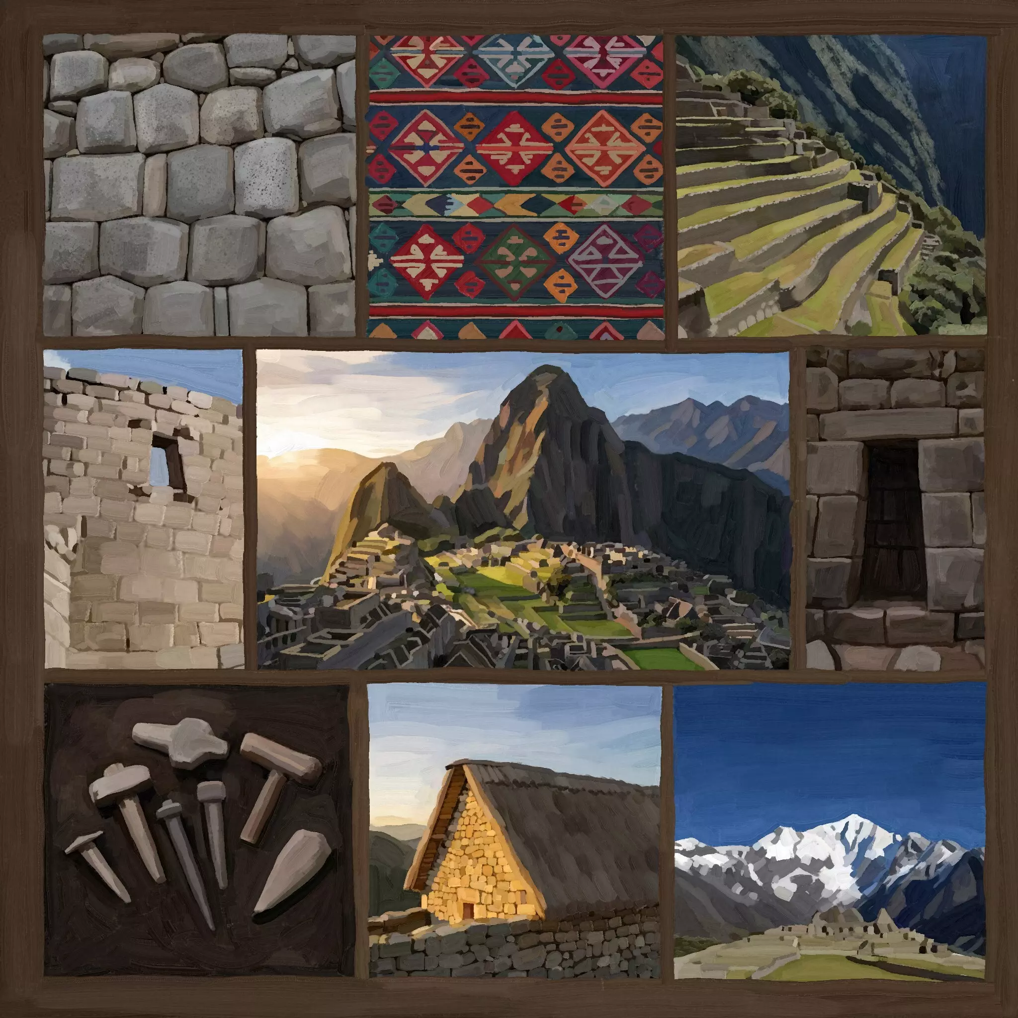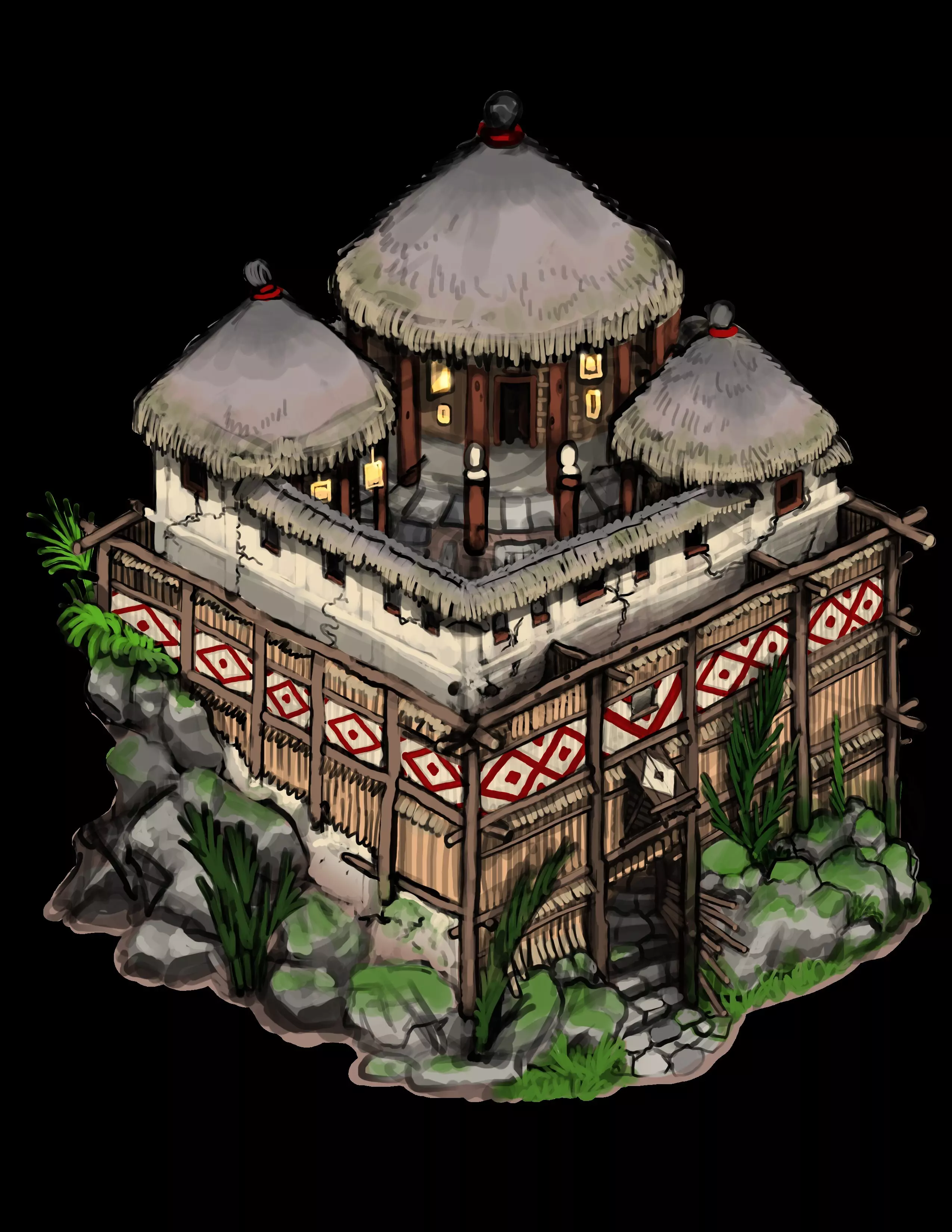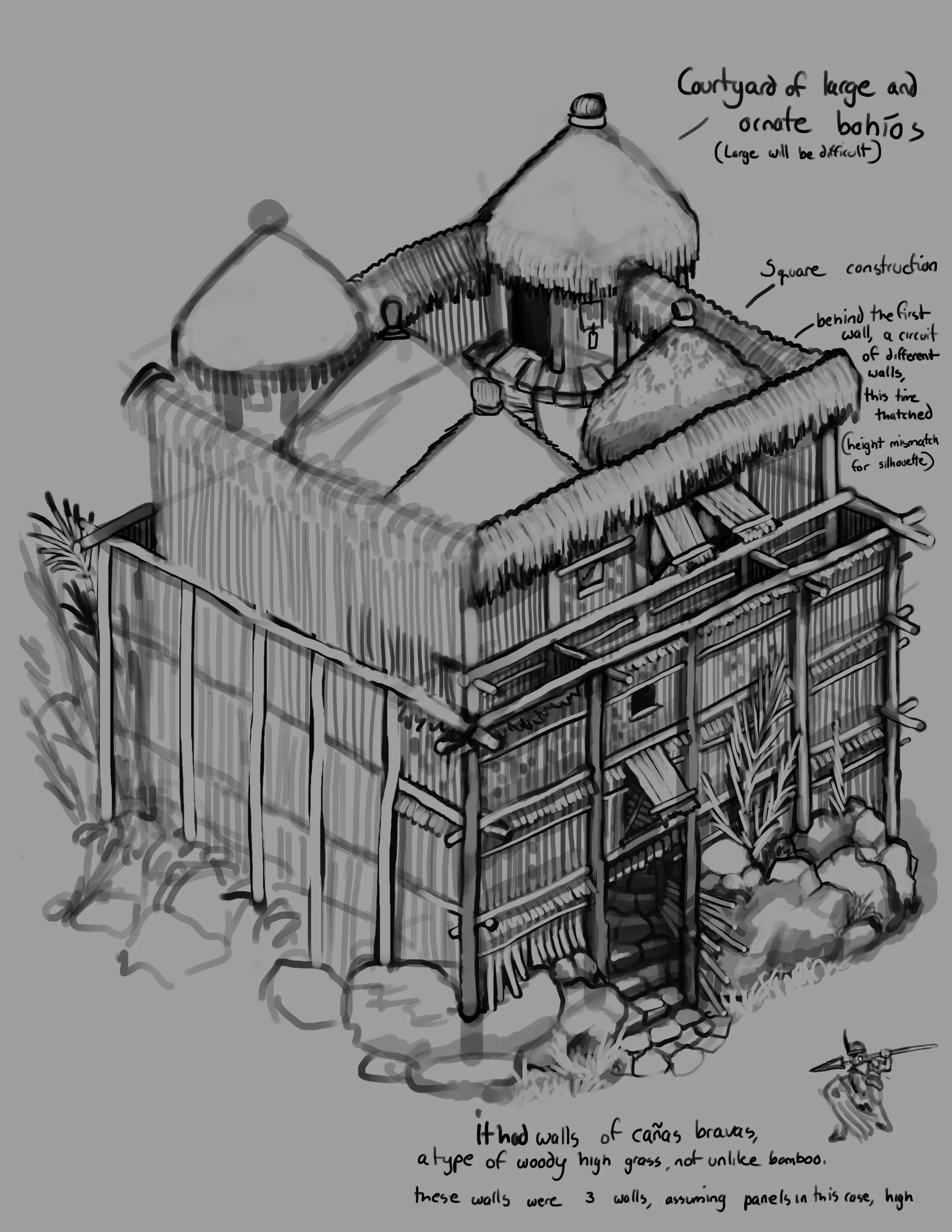 《最后的酋长》氛围板 概念艺术家:乔纳森 在开始设计南美洲建筑组时,我们的重点主要放在印加遗迹上。在很大程度上,这一点一直没有改变。但在早期,我们决定扩大范围,纳入马普切人、穆伊斯卡人和图皮人的丰富传统,并从他们的日常建筑如鲁卡屋、博希奥屋和奥卡屋中汲取灵感。 [table noborder=1 equalcells=1][tr][td]
