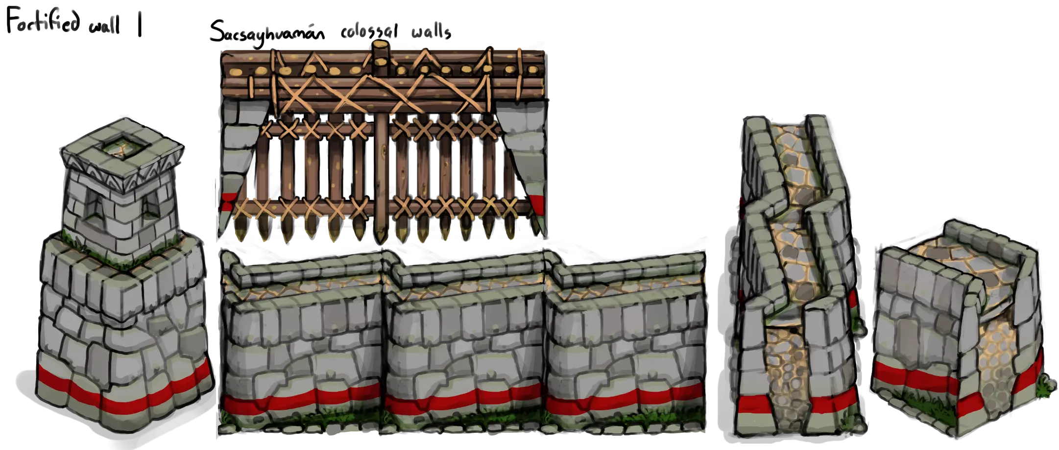 [/td][/tr][/table] [table noborder=1 equalcells=1][tr][td]强化城墙[/td][td]强化城墙摧毁[/td][/tr][/table] 印加多边形石砌工艺、先进的水利工程、镀金表面以及独特的无交叉屋顶设计,均为城堡和帝王时代建筑的设计提供了灵感。萨克塞华曼堡垒在强化城墙和大学的设计中起到了重要作用。此外,封建时代的磨坊下方设有螺旋井,巧妙融入了纳斯卡风格的设计元素。 [table noborder=1 equalcells=1][tr][td]