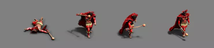 精英圣殿卫兵 | 精英冠军战士 | 加尔瓦里诺 - 战役英雄 Nebeolise,装配艺术家/3D动画师 在开始制作动画时,我们总是首先深入研究文化和历史,以确保单位的每一个动作都显得真实可信。 以伊比拉佩玛战士为例。为了恰当地制作他们的动画,我们需要了解他们在社会中的角色以及他们的战斗战术。即使是像确定一个 idle pose(待机姿势)这样简单的事情,也很大程度上取决于他们的传统和武器。此外,由于他们挥舞着非常沉重的棍棒,我们必须确保在挥击动作中能体现出其重量感和力量感。