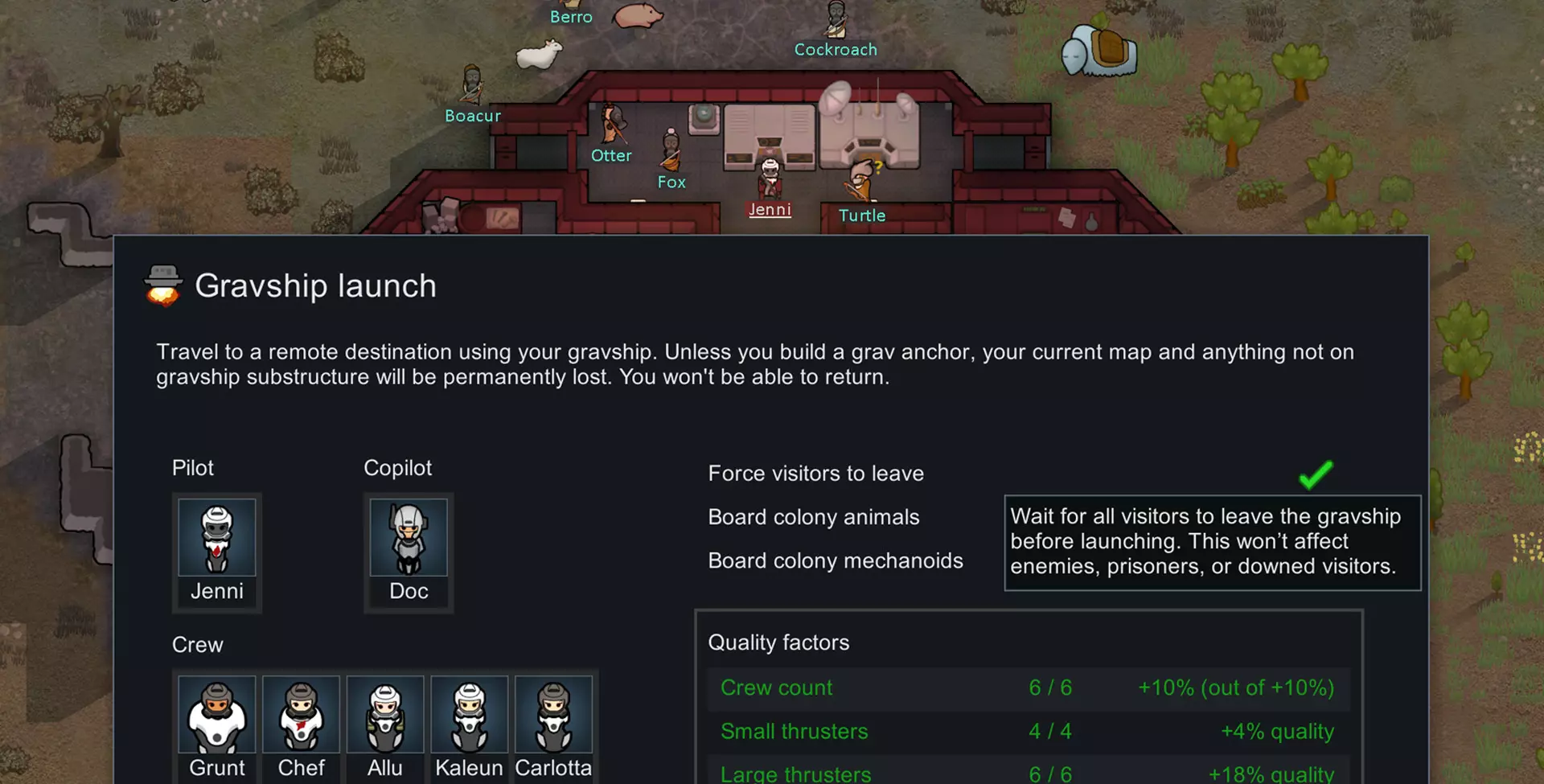 We’ve also made several technical improvements to the game. We reduced the generation and loading times for worlds with 100% coverage, as well as added some tools to help our modders. This update should be compatible with all savegames and mods. The full changelog is below to browse. If you need to report a bug, or you’re having a problem while playing, please join us on the official RimWorld development Discord. Have fun out there! - Tia Website | X | BlueSky | Reddit | Facebook Changelog Added new options to the gravship launch window to easily get colony animals and mechanoids onboard before launching, as well as to remove neutral pawns off the gravship. Added a "view range" option to the pilot console which lets you quickly see the range of your gravship. Added snowy visuals for trees and some plants when they’re in a sufficiently snowy area. Added the vacskin gland prosthetic which protects against vacuum. Requires the Odyssey and Royalty expansion. Added a “low gravity adapted” gene to the starjack xenotype, as well as rebalanced the starjacks genes. Requires Odyssey and Biotech expansion. Bridges built in space now have unique art for their borders. Improvements & Balance Changes Fishing now has its own category in the work tab. Pursuing mechanoids in the gravship scenario now arrive in two massive raids per gravship map and then stop. The final mechhive raid will now be 50% stronger. Improved rewards for destroying the mechhive. You now gain +50 reputation with all factions, and the colonist that destroyed the mechhive gains a larger and longer-lasting positive moodlet. Mechanitors can now summon mechanoid bosses while in space. Insect lair entrances are now collapsable. Added the ability to sow timbershrooms in glowforests with tree sowing research. Shuttles are no longer blocked from landing on items. Passenger shuttles no longer destroy more roof than they need to when landing. Allow quests to retarget themselves to suitable maps if they generate targeting an unsuitable one. In orbit, this allows you to accept quests that don’t work in space by flying down to the planet. Gravships no longer clear pollution when landing. Sentience catalyst now removes roaming and fence-blocked status from animals. The gravship scenario now requires you to start with at least one colonist capable of intellectual work. This prevents you from becoming immediately stranded. Worshipful village raids now occur every 24 hours and are smaller in size. Gravships can once again land at worshipful villages. Having a gravship on a temporary map will prevent the map from closing if all colonists are dead or gone. Pawns won't automatically remove their vacuum-resistant apparel if they’re in a dangerous vacuum. Planning designator shows map boundary outline in space. Increased perceived path cost of shallow lava to discourage dangerous pathing. More pawns from the Royalty and Ideology expansions can now spawn as starjacks. Hermit crabs no longer walk sideways. They also live considerably longer. Raiders won't try to ignite buildings when they are in a vacuum. Bestowing ceremony can now be accepted in space. Removed forced low-power mode for vac barriers when they're not in space, allowing them to still function while on the planet. Prevented meteors from landing directly on top of grav anchors. Added info on the grav anchor to the gravship launch confirmation. Improved credits layout to reduce the vertical size. Archean trees now self-heal like other special trees. Updated links in the main menu. Added confirmation if reforming caravan would cause your gravship to be lost. Landing a gravship on polluted terrain now slowly fades the pollution visuals in. Updated creative content rewards. Performance Reduce time required to load a 100% world save file. Reduce time to generate a 100% world by about 40%. Added the ability for mods to load textures from DDS files, which should load significantly faster than PNG files and potentially at higher quality. Added custom atlas packing implementation which should allow the game to start slightly faster, while using less memory. Improve performance when hovering a world tile out of gravship range. Technical & Modding Unify all MayRequire and IfModActive checks to strip suffixes, trim, and lower-case package IDs Improved the moddability of animal abilities. It is now easier for modders to add abilities to player animals without using the Special Trainables system. Additionally, adding multiple abilities through Special Trainables is now supported. Increased max radius of GenRadial to 80 and optimize radius calculations. We now run back-compat code if the active mod list has changed, so that when adding expansions, all needed data is added to objects. Fix: plant.wildBiomes wasn't checking for duplicate entries in biomes. (Only affects mods.) Fix: Modded things with non-North default rotations not being placed correctly on gravships and prefabs Fixes Fix: Traders guild faction no longer mentions giving gifts in their hostility letter. Fix: Outfit stands are once again minifiable and correctly drop their inventory contents when deconstructed while minified. Fix: Can't sell weapons held in outfit stands. Fix: Pawns using the incorrect seat on couches when socially relaxing. Fix: Properly fail strange signal quest if player loses their home map. Fix: Animals not checking reservations on fishing cells. Fix: Animals able to fish through foundations. Fix: Unable to remove pawns from being the target on certain psychic rituals. Fix: Freeze or crash on boot for players with specific AMD integrated GPUs. Fix: Out of bounds error trying to determine shuttle landing position when few options are possible. Fix: Combat log occasionally mentions flesh-related injuries for mechanoids. Fix: Shuttle load list getting reset after launching. Fix: Lava emergence could go through walls in specific situations. Fix: Pawns not getting comfort from chairs while fishing. Fix: Paralytic a