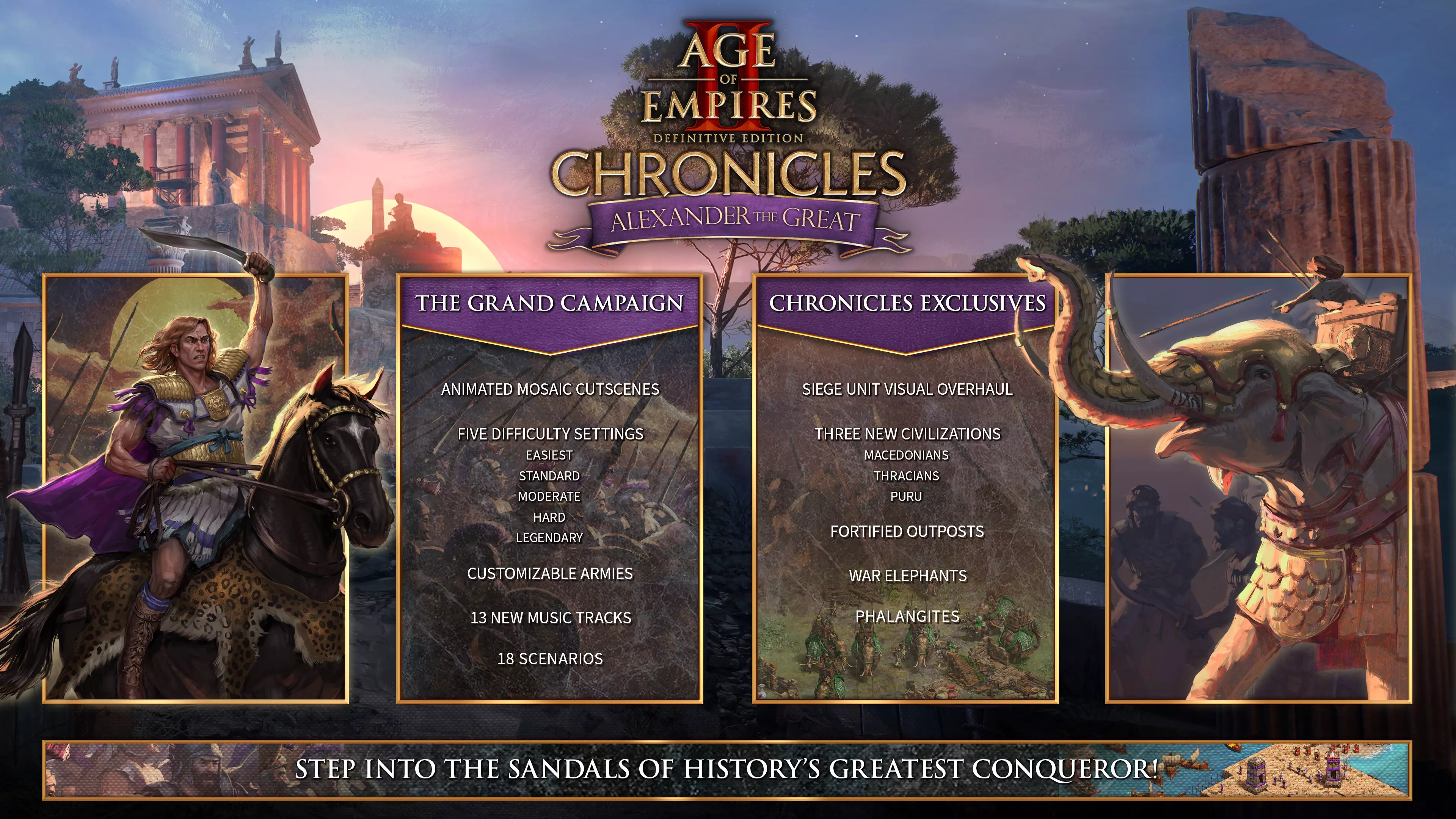 《帝国时代2:决定版》全新DLC“编年史:亚历山大大帝”现已登陆Steam!化身为历史上最伟大的征服者,开启一段波澜壮阔、以叙事为主导的战役,追溯亚历山大大帝从早熟少年到震撼世界的统治者的崛起之路。 本DLC由我们的开发合作伙伴CaptureAge打造,“编年史:亚历山大大帝”带来三大全新文明——马其顿人、色雷斯人和普鲁人,并包含一个拥有18个场景的宏大战役。通过动画马赛克过场、可自定义的战役军队、视觉与音频升级等丰富内容,为你生动呈现这段历史! 想了解更多信息?可以先熟悉“编年史”系列,或预览“编年史:亚历山大大帝”中的全新宏大战役!