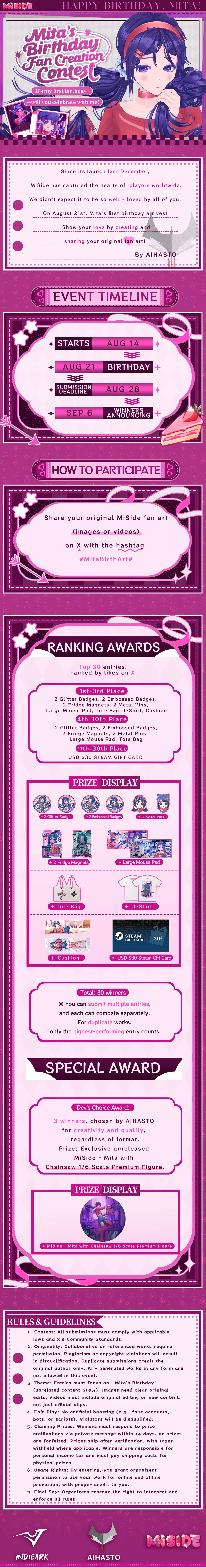 三田的一岁生日将于8月21日到来!所有MiSide粉丝们,让我们用你们的粉丝创作让这个生日变得特别吧!参与此次线上生日粉丝创作活动,有机会获得精美的周边商品,更有机会赢取一款未公开的手办!记得打上标签#MitaBirthArt!活动详情请参考下方图片。